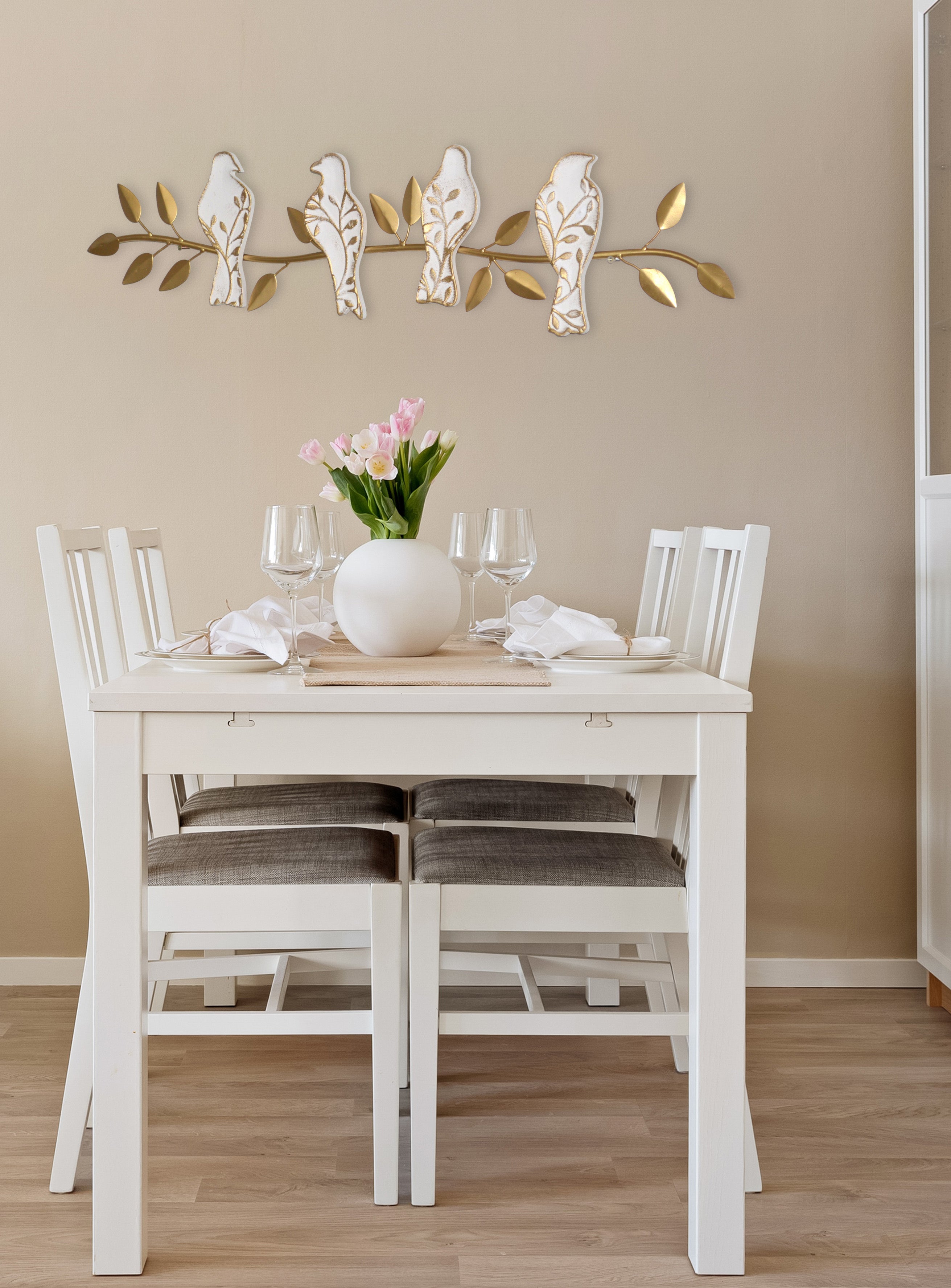 Apportez chaleur et poésie à votre intérieur avec cette charmante décoration murale représentant quatre oiseaux posés sur une branche. Les oiseaux sont fabriqués en MDF laqué crème antique, avec de délicates décorations métalliques dorées, ajoutant une touche d’éclat tout en conservant une esthétique douce et naturelle.