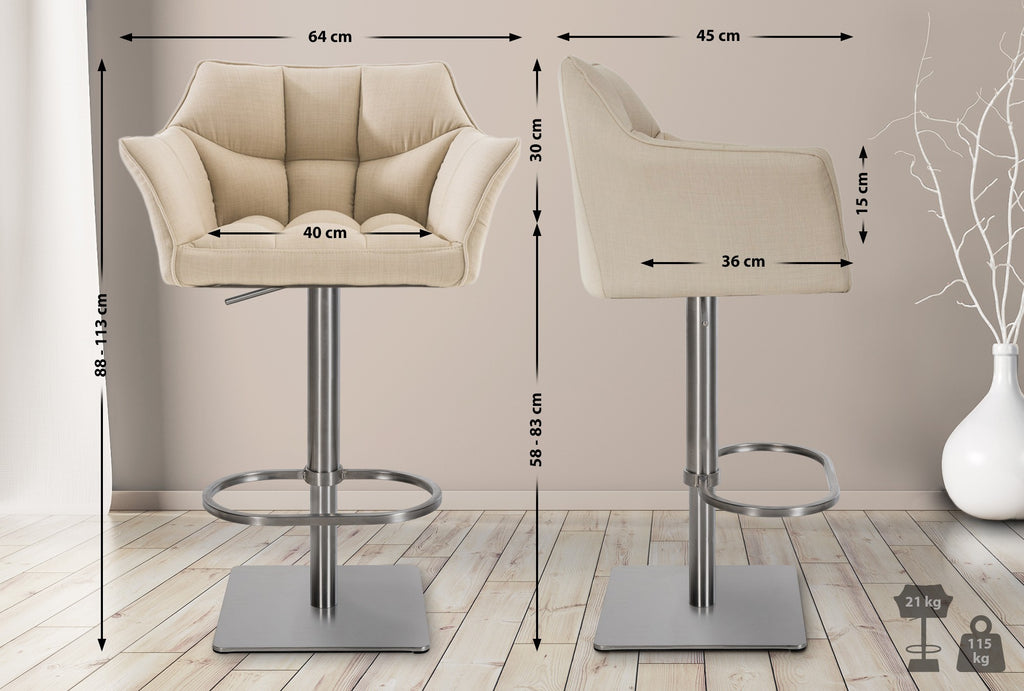 Lot de 2 tabourets de bar réglable en tissu beige assise enveloppante capitonnée avec base carrée en acier inoxydable 10_0006759