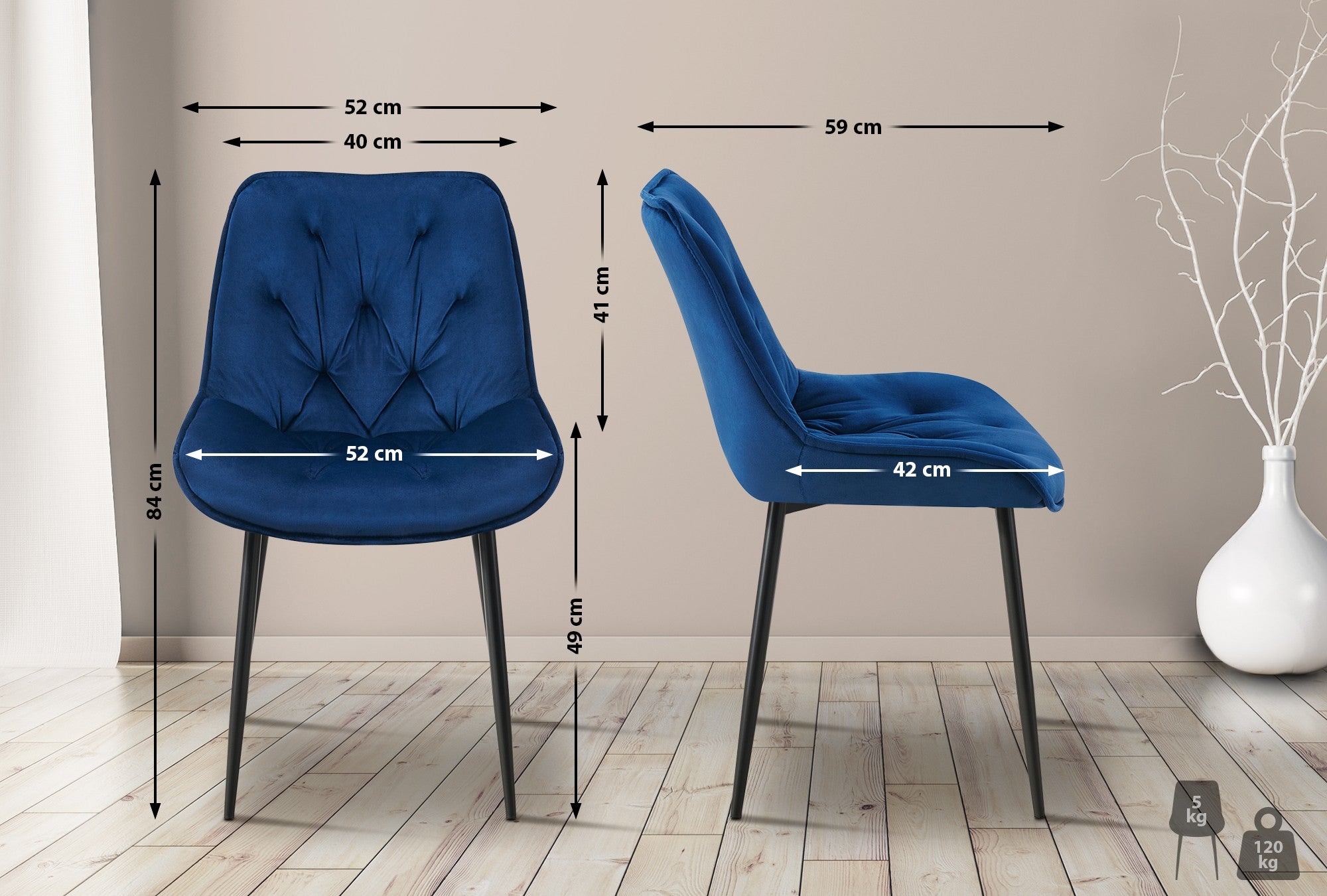 La chaise de salle à manger allie confort d'assise et style moderne. Cette chaise rembourrée est idéale pour votre table de salle à manger, votre cuisine, votre salon et bien plus encore. Le rembourrage agréable de l'assise et du dossier est essentiel pour un confort optimal. L'assise est recouverte de velours facile d'entretien avec un motif matelassé tendance. La base de cette chaise de salle à manger est un cadre stable à quatre pieds noir en métal robuste. Cela signifie que la chaise de cuisine peut supporter en toute sécurité une charge allant jusqu'à 120 kg. Les patins de protection protègent les sols fragiles.