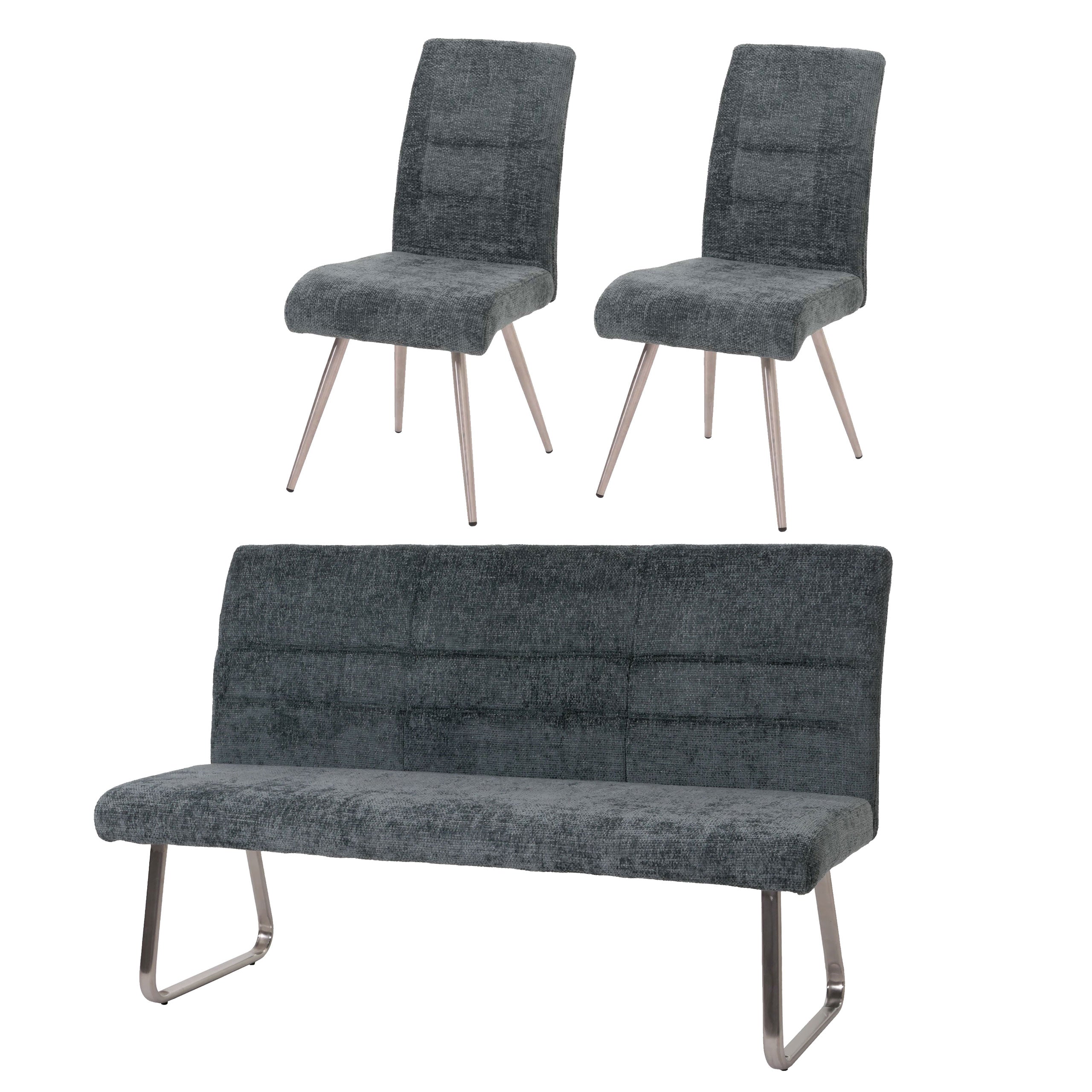 Lot de 2 chaises de salle à manger + banc 180 cm inox brossé et tiss chenille bleu-vert 04_0008280