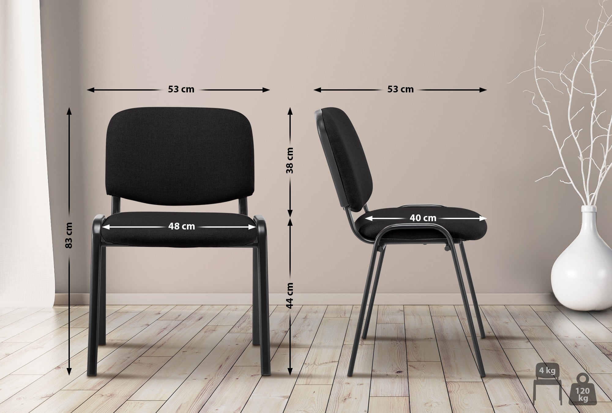 L'assise et le dossier rembourrés, recouverts d'un tissu résistant, offrent un confort longue durée. Grâce à son piètement en métal noir à quatre pieds, la chaise est stable et robuste, avec une capacité de charge maximale de 120 kg. Empilable jusqu'à quatre chaises, elle permet un rangement et une utilisation peu encombrants et flexibles. Les protections de sol en plastique empêchent les sols sensibles d'être endommagés.