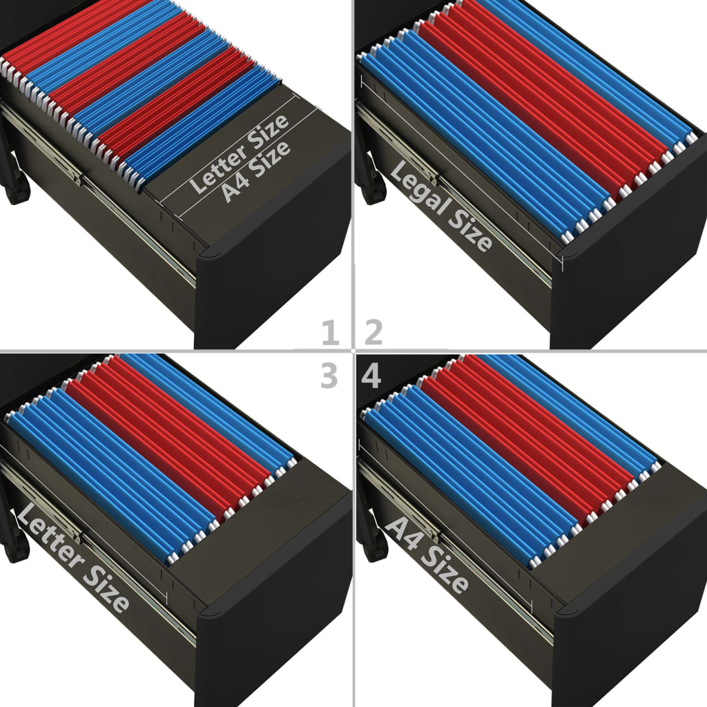 Chaque tiroir est équipé d’une barre de suspension amovible, qui peut être librement combinée pour stocker des dossiers suspendus de taille lettre, taille légale et A4.