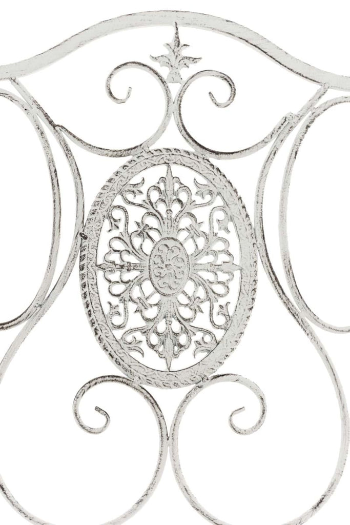 Ces chaises sont conçues dans du fer solide et enduites de patine assurant cet aspect vieilli qui fait tout leur charme. L'assise est large et conçue dans un ensemble de lattes qui la traversent en largeur. Le dossier est, quant à lui, orné d'arabesques élégantes, faites à la main.