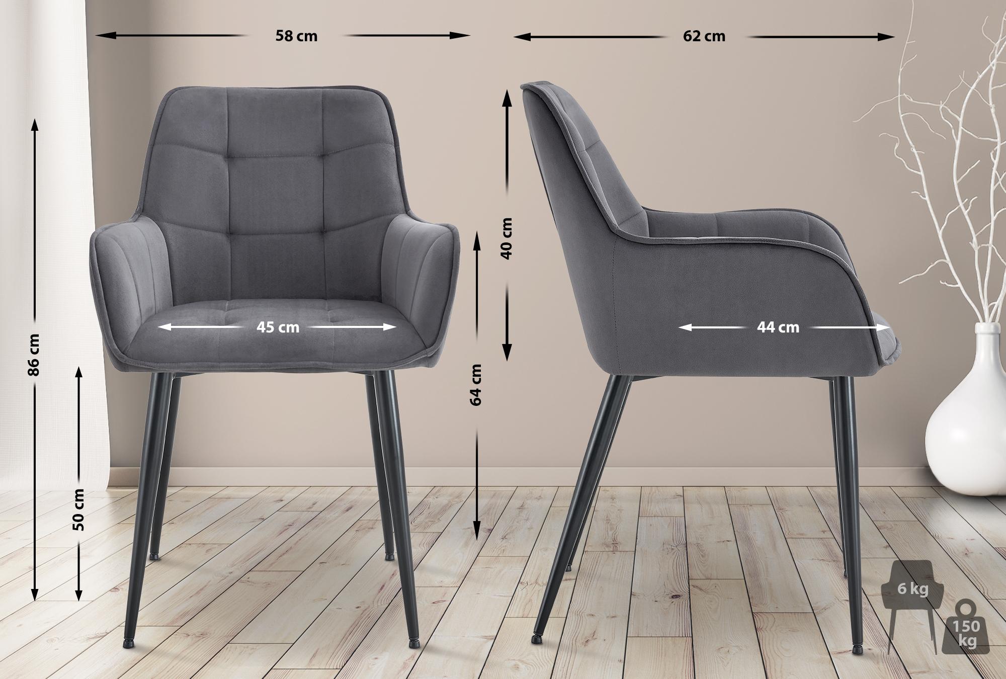 Cette chaise de salle à manger allie design moderne et fonctionnalité confortable. L'assise et les accoudoirs rembourrés offrent un soutien confortable. Le revêtement en velours facile d'entretien lui confère une allure élégante, tandis que la structure métallique robuste avec patins de protection protège le sol des rayures et empêche les glissements. Avec une capacité de charge allant jusqu'à 150 kg et une forme ergonomique, cette chaise est idéale pour les longues périodes assises. Le fauteuil est disponible en plusieurs coloris. Cette chaise s'intègre harmonieusement dans une variété de styles d'intérieur - parfaite pour la salle à manger, la chambre ou comme chaise de lecture.