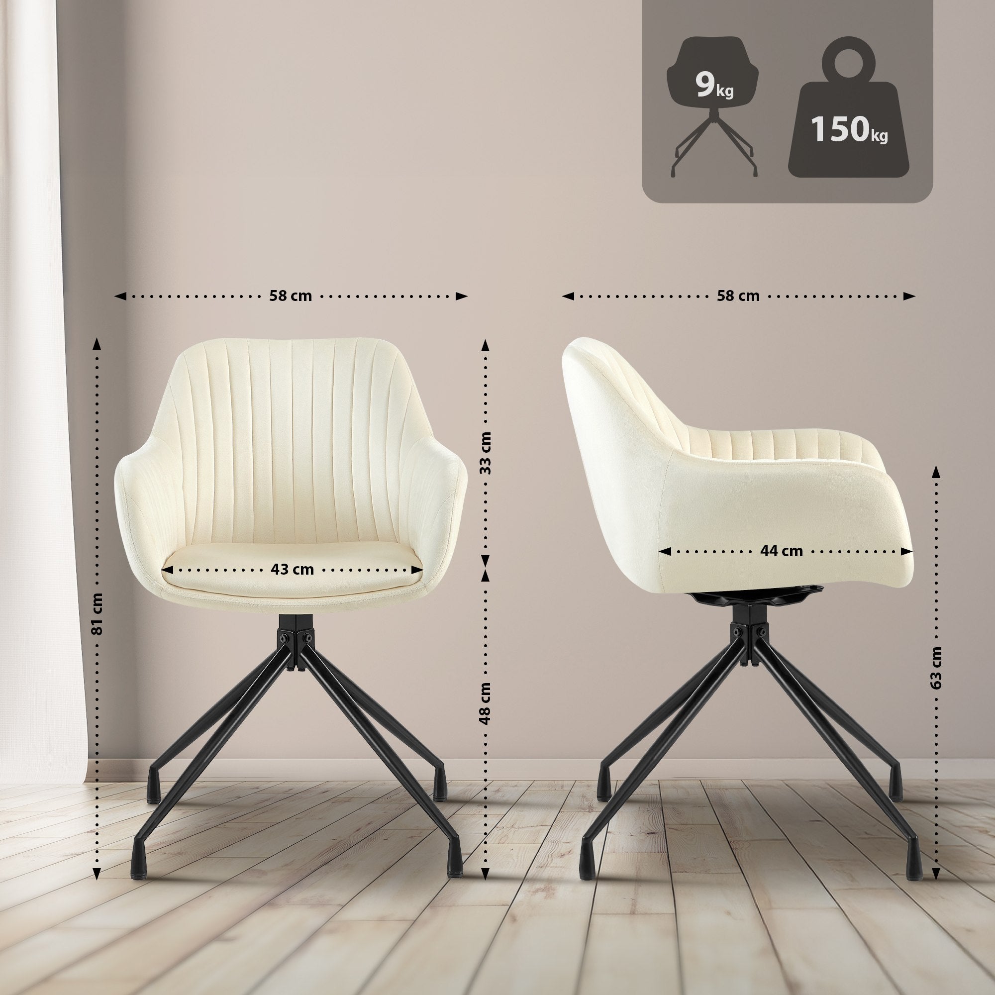 La fonction pivotante pratique permet de faire pivoter l'assise à 180 degrés, offrant ainsi une liberté de mouvement supplémentaire. La stabilité est assurée par le cadre à quatre pieds en métal noir mat avec revêtement en poudre, qui offre une capacité de charge maximale de 150 kg.