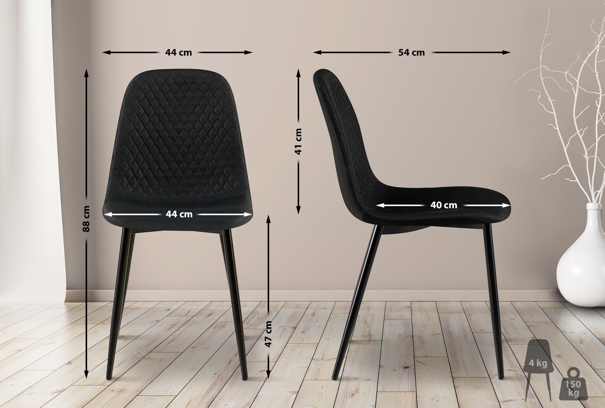 Les robustes cadres en métal noir assurent la stabilité et une capacité de charge élevée, jusqu'à 150 kg par chaise. Des patins de protection intégrés protègent les surfaces sensibles comme le parquet ou le carrelage des rayures, tout en permettant un déplacement aisé. Avec une hauteur d'assise confortable de 47 cm, ces chaises offrent un confort optimal, même lors de longs dîners en famille ou entre amis.