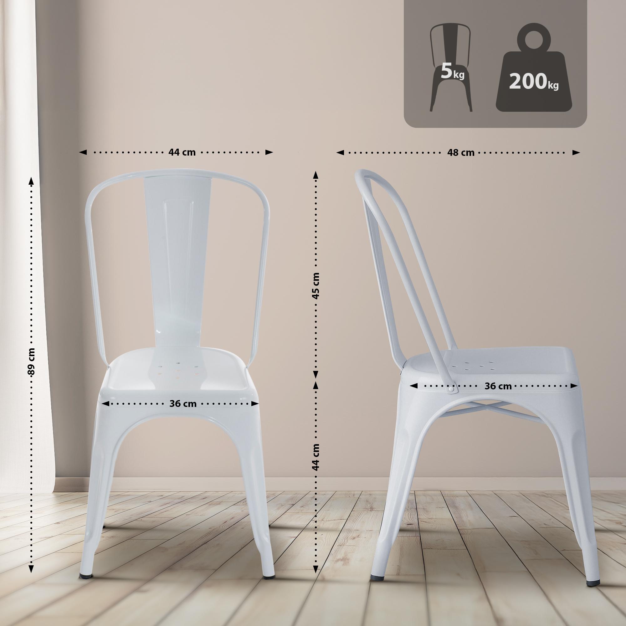 Fabriquées en métal, les chaises sont particulièrement robustes et peuvent supporter jusqu'à 200 kg. Leur surface facile d'entretien se nettoie facilement avec un chiffon humide. Les patins protègent les sols fragiles des rayures.