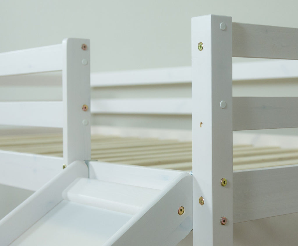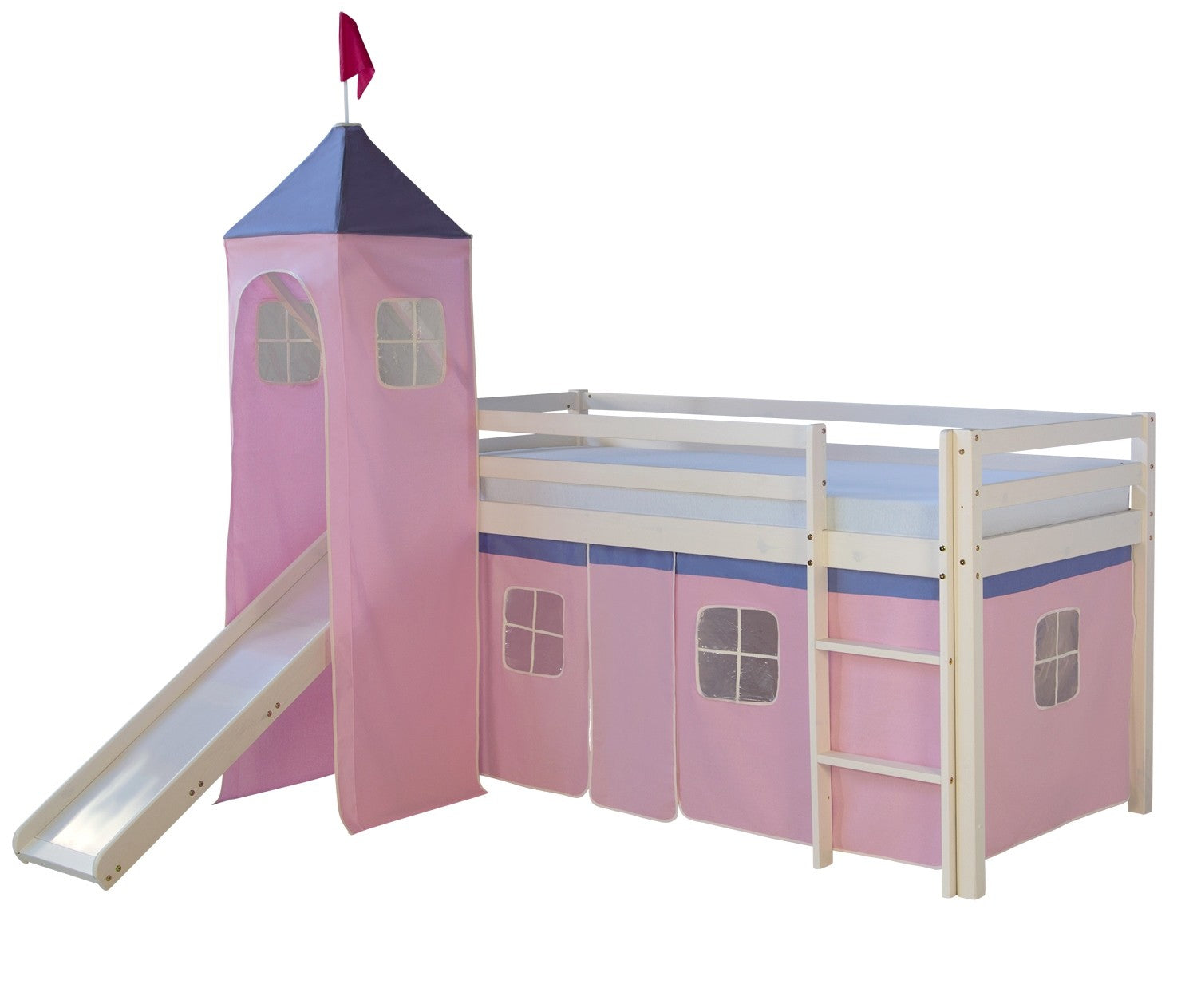Lit mezzanine 90x200cm avec échelle toboggan en bois blanc et toile rose incluse LIT06153