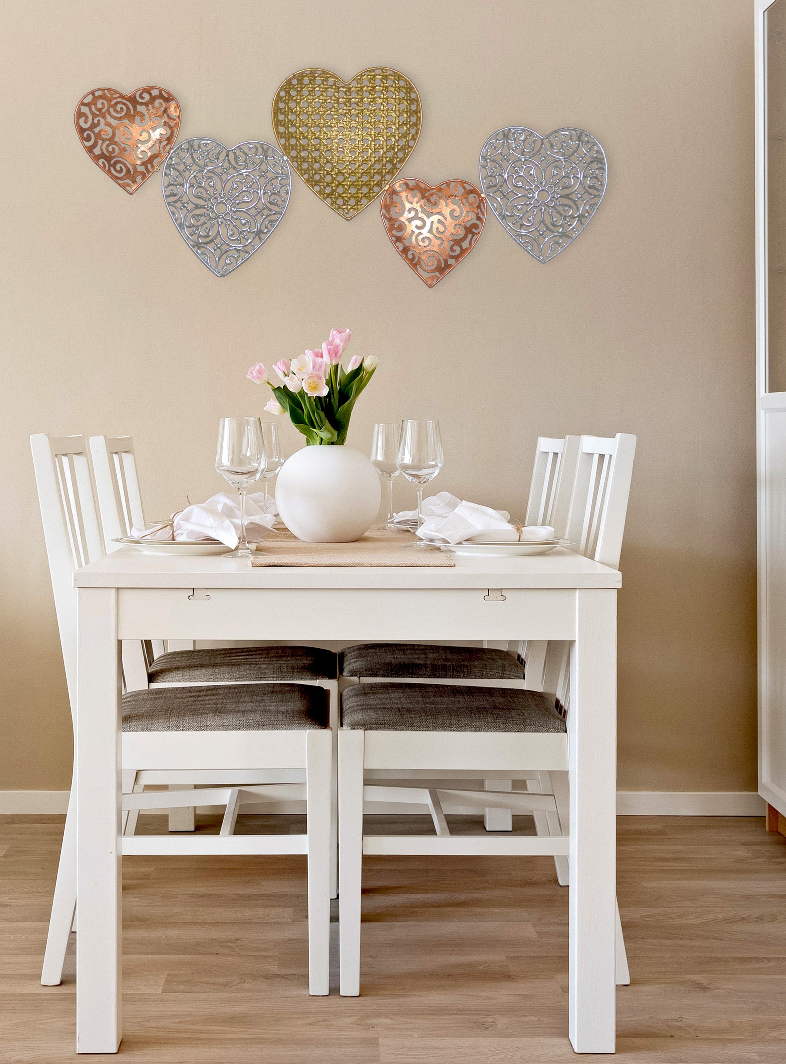 Apportez une touche de romantisme moderne à votre décoration intérieure avec cette magnifique décoration murale en métal, composée de cœurs de tailles variées, joliment laqués dans des teintes cuivrées, argentées et dorées.
