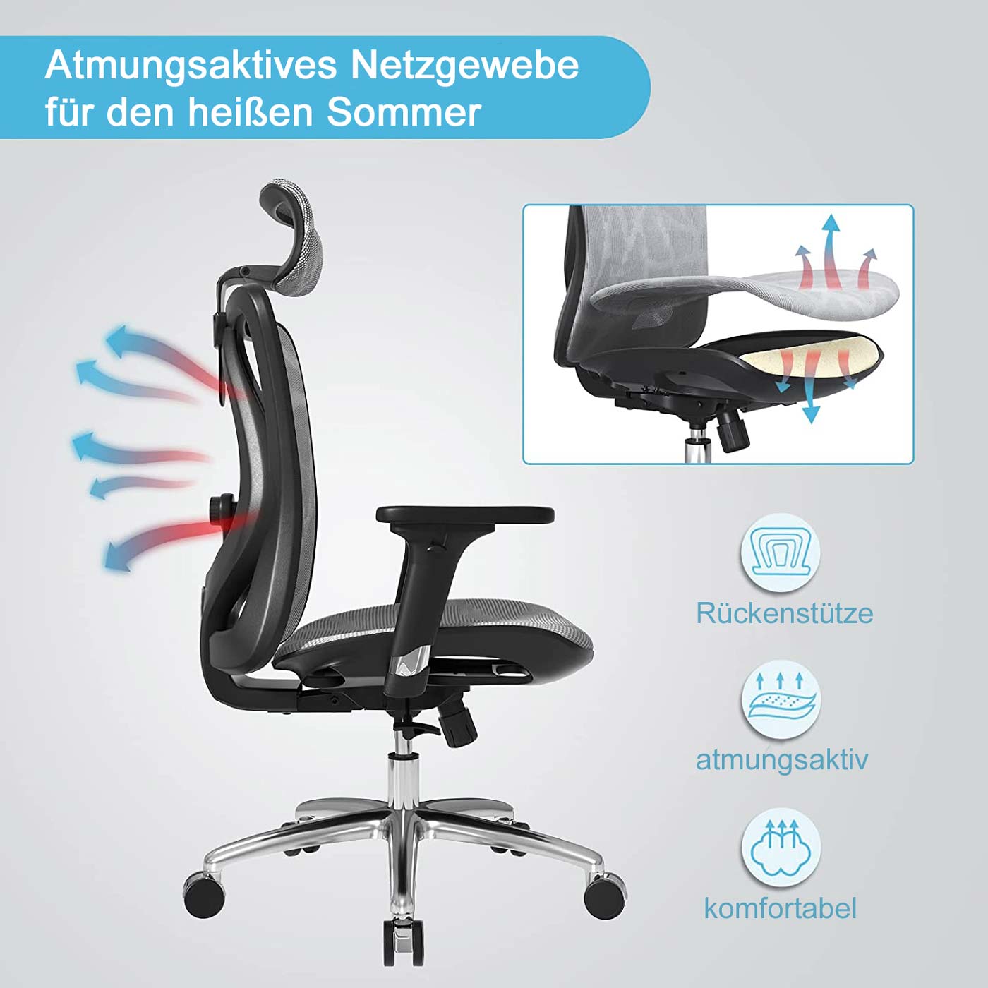 Cette chaise de bureau facilite votre travail quotidien à la maison. Grâce au revêtement en maille sur le dossier, vous ne transpirez pas même par températures estivales et vous pouvez vous asseoir confortablement pendant des heures.
