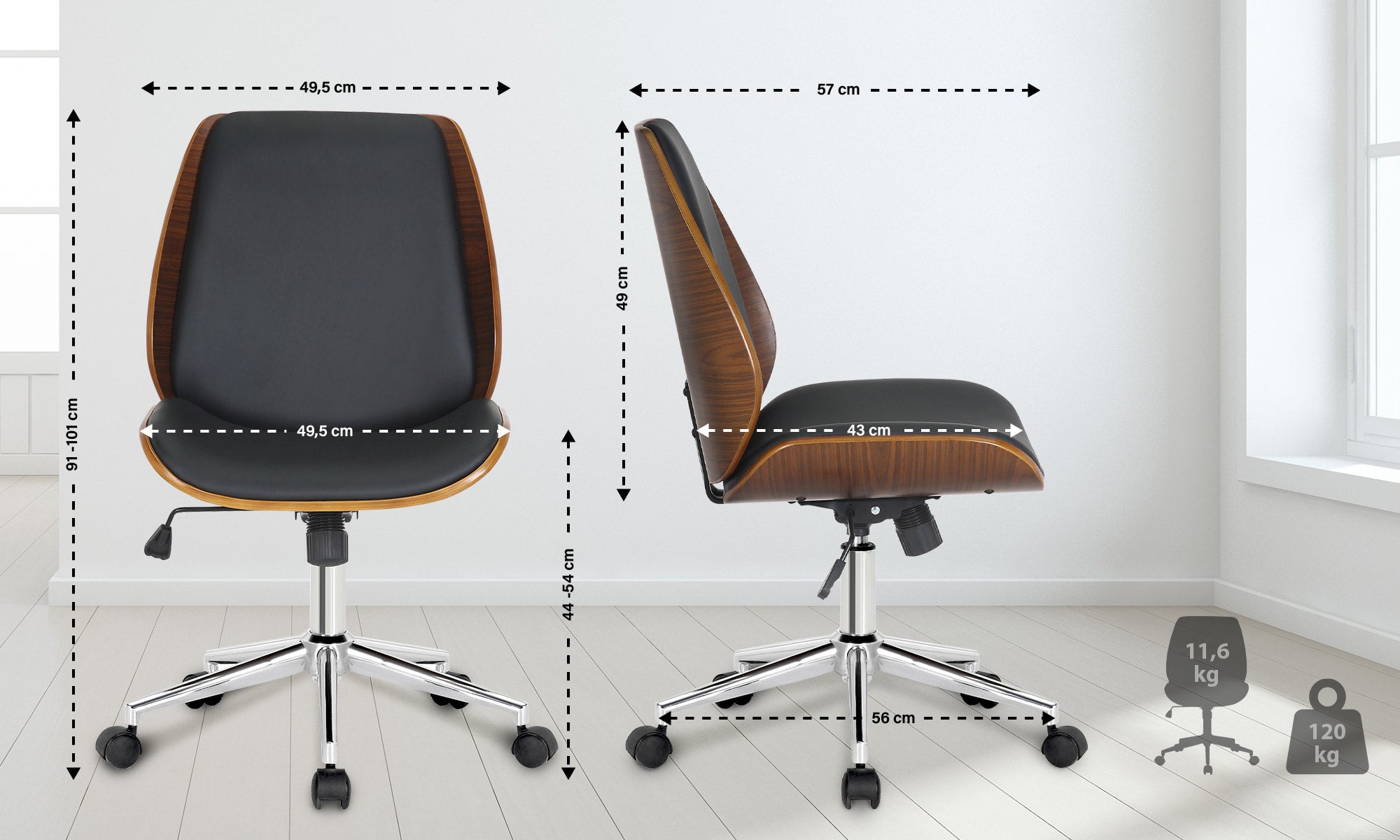 Fauteuil de bureau sur roulettes pivotante et réglable design moderne synthétique noir bois et métal chromé