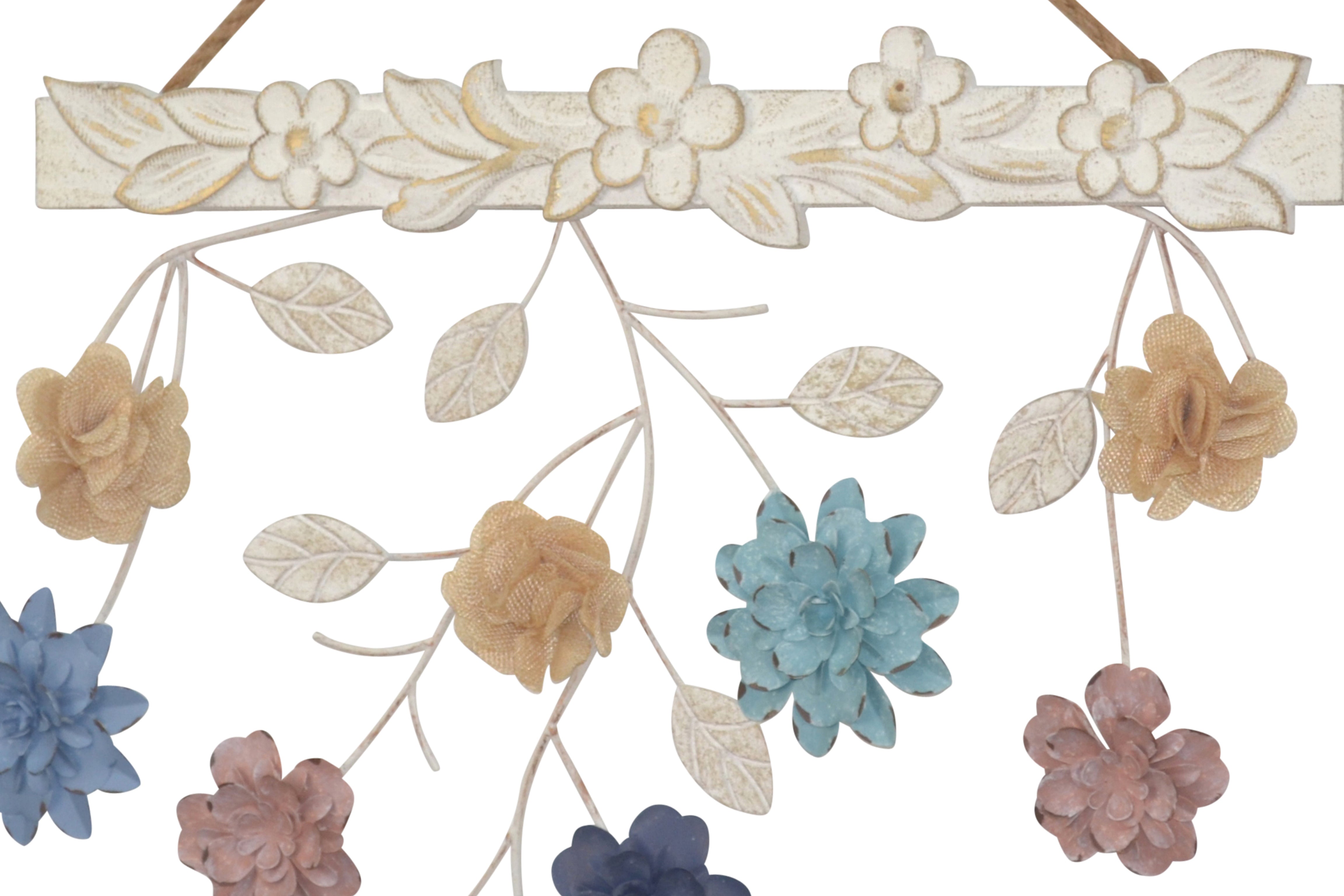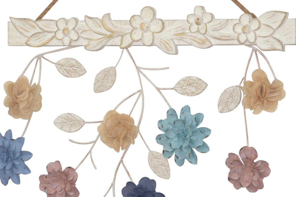 Créez une atmosphère douce et poétique avec cette décoration murale unique mêlant matériaux naturels et détails raffinés. Composée d’une base en MDF décorée de motifs floraux crème, cette pièce se prolonge avec des branches métalliques aux fleurs colorées, accompagnées de délicates fleurs en tissu beige. L’ensemble est suspendu à l’aide d’une élégante corde en lin, ajoutant une touche bohème chic à votre intérieur.