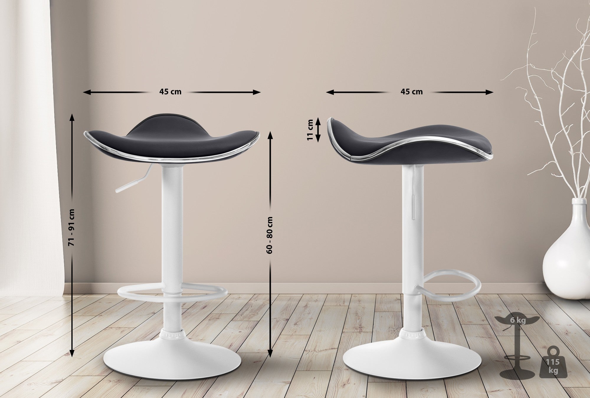 Tabouret de bar x1 assise ergonomique en PVC noir pied en trompette en métal blanc 10_0005386