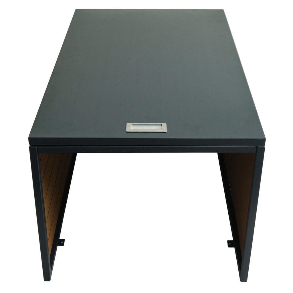 Matériaux : WPC (60 % bois, 30 % HDPE, 10 % additifs) et métal
