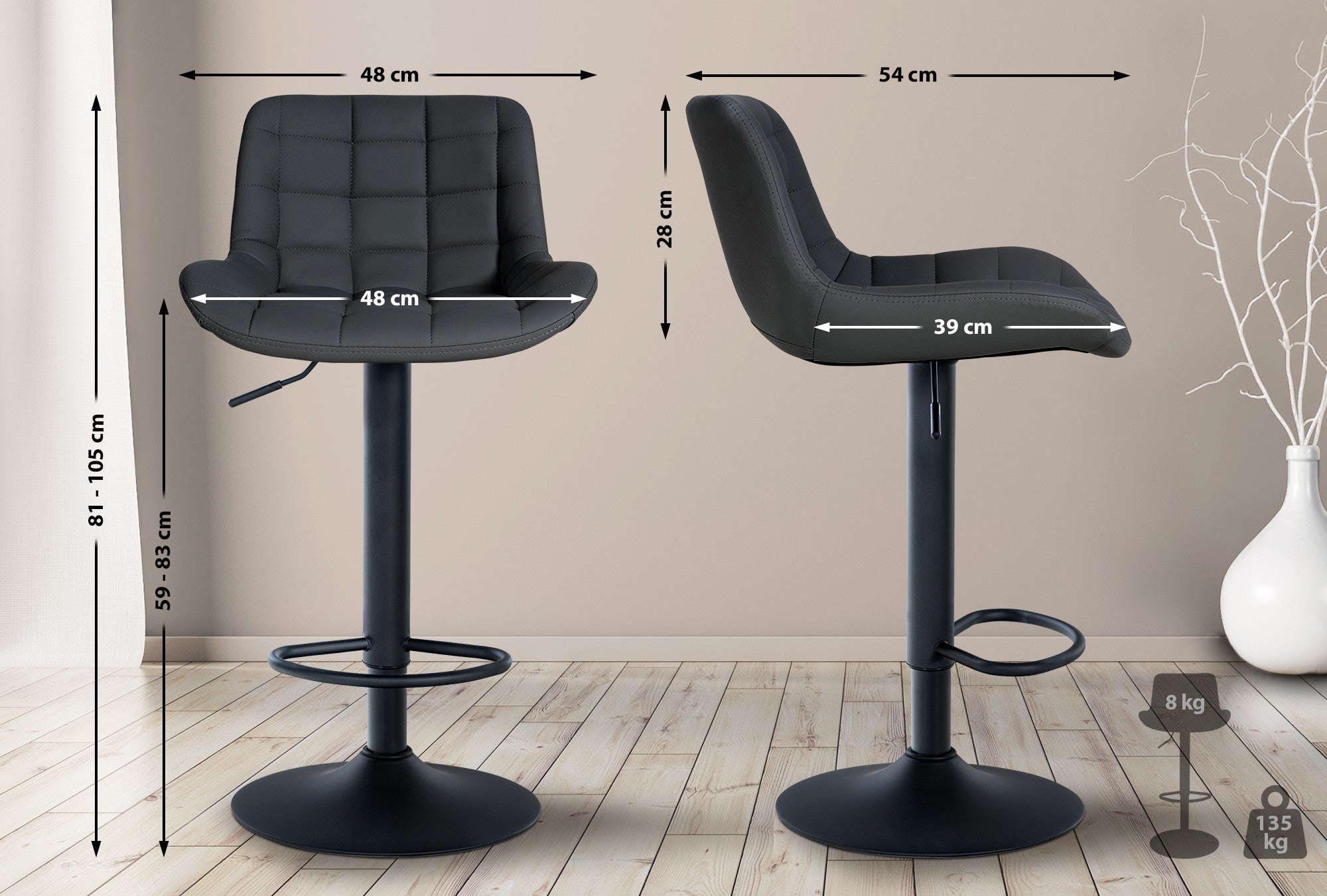Grâce à sa structure en métal, le tabouret pivote à 360° et est réglable en hauteur, permettant ainsi de l'adapter individuellement aux besoins de l'utilisateur. La base robuste avec repose-pieds et patins assure une stabilité supplémentaire et une assise confortable, même pendant de longues périodes.