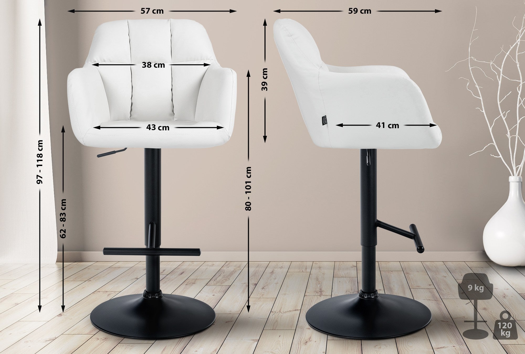 Le tabouret de bar se distingue par son design fonctionnel et son confort d'assise. Sa hauteur réglable de 97 à 118 cm ainsi que sa largeur de 57 cm et sa profondeur de 59 cm permettent de l'adapter aux hauteurs de comptoir les plus diverses. L'assise de 43 x 41 cm et le dossier sont conçus pour offrir soutien et confort. Des accoudoirs et un repose-pieds sur le pied en trompette complètent la fonctionnalité, tandis que la protection du sol évite d'endommager le support. Avec un poids de 9 kg et une capacité de charge allant jusqu'à 120 kg, le tabouret de bar est un siège robuste. La fonction de rotation à 360° favorise en outre la mobilité et la flexibilité.