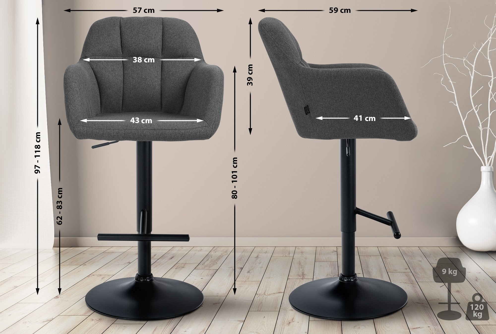 Le tabouret de bar se distingue par son design fonctionnel et son confort d'assise. Sa hauteur réglable de 97 à 118 cm ainsi que sa largeur de 57 cm et sa profondeur de 59 cm permettent de l'adapter aux hauteurs de comptoir les plus diverses. L'assise de 43 x 41 cm et le dossier sont conçus pour offrir soutien et confort. Des accoudoirs et un repose-pieds sur le pied en trompette complètent la fonctionnalité, tandis que la protection du sol évite d'endommager le support. Avec un poids de 9 kg et une capacité de charge allant jusqu'à 120 kg, le tabouret de bar est un siège robuste. La fonction de rotation à 360° favorise en outre la mobilité et la flexibilité.