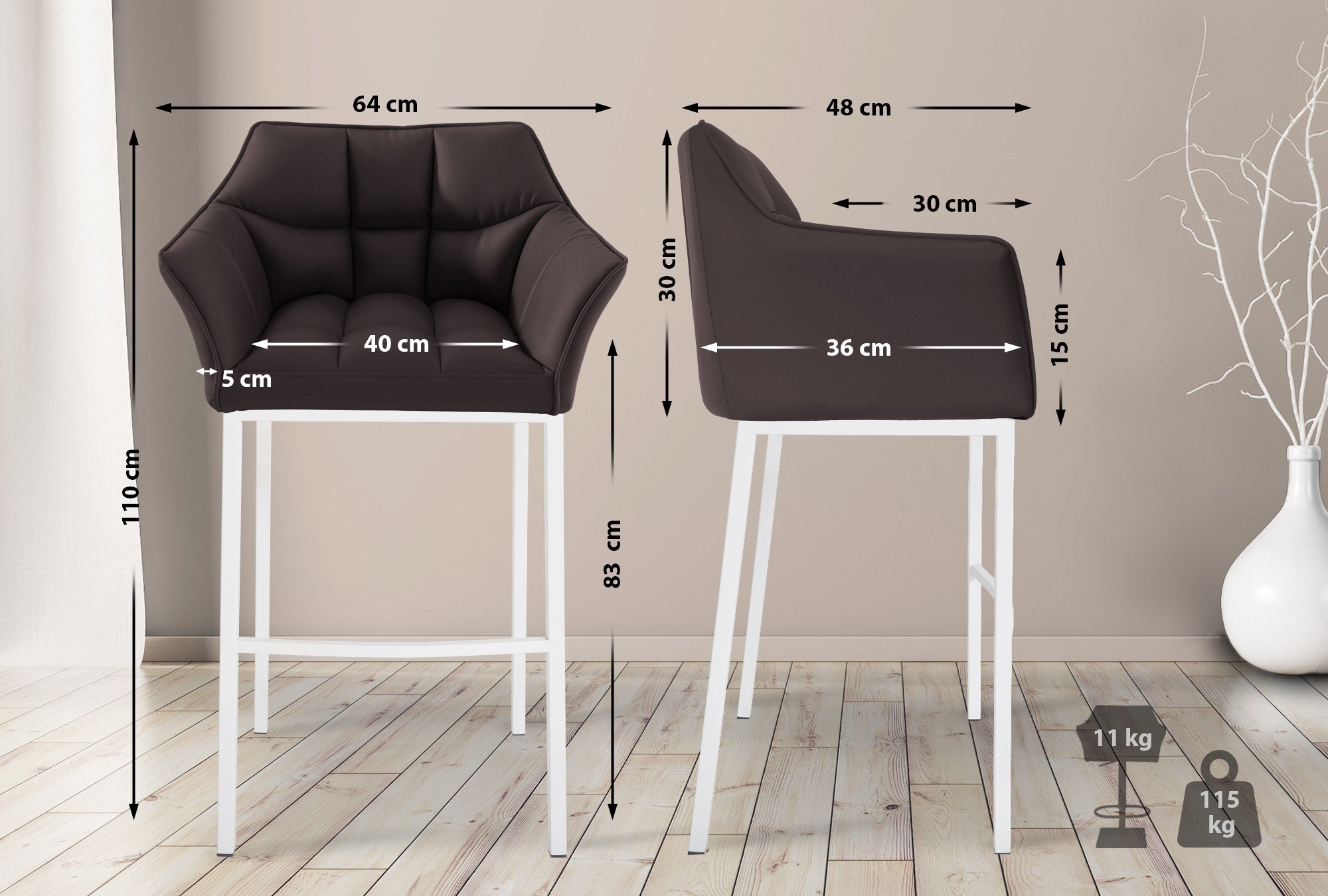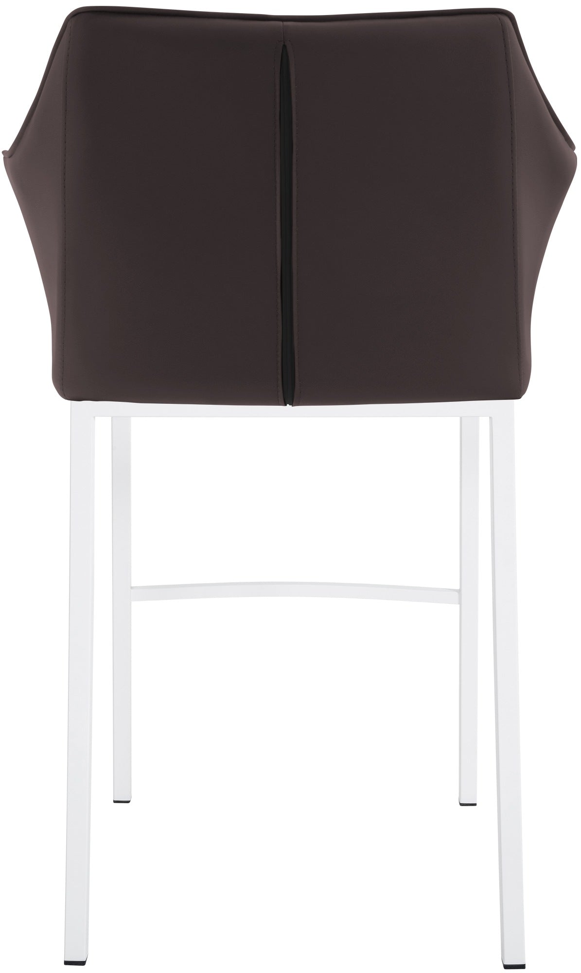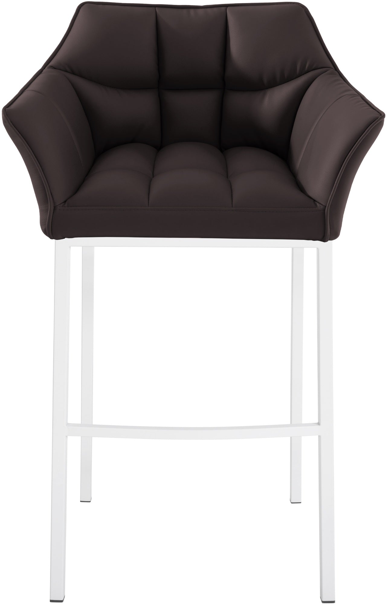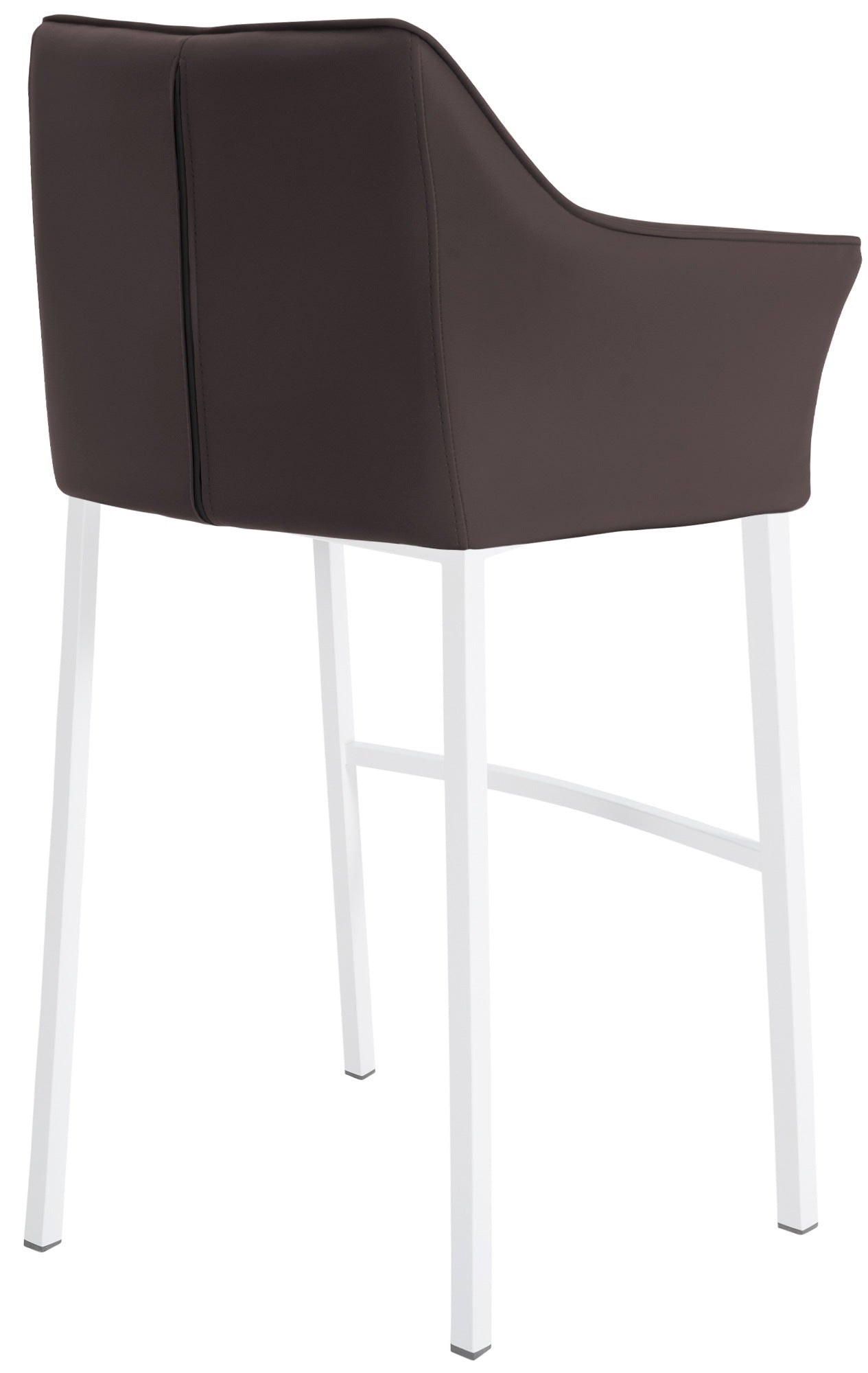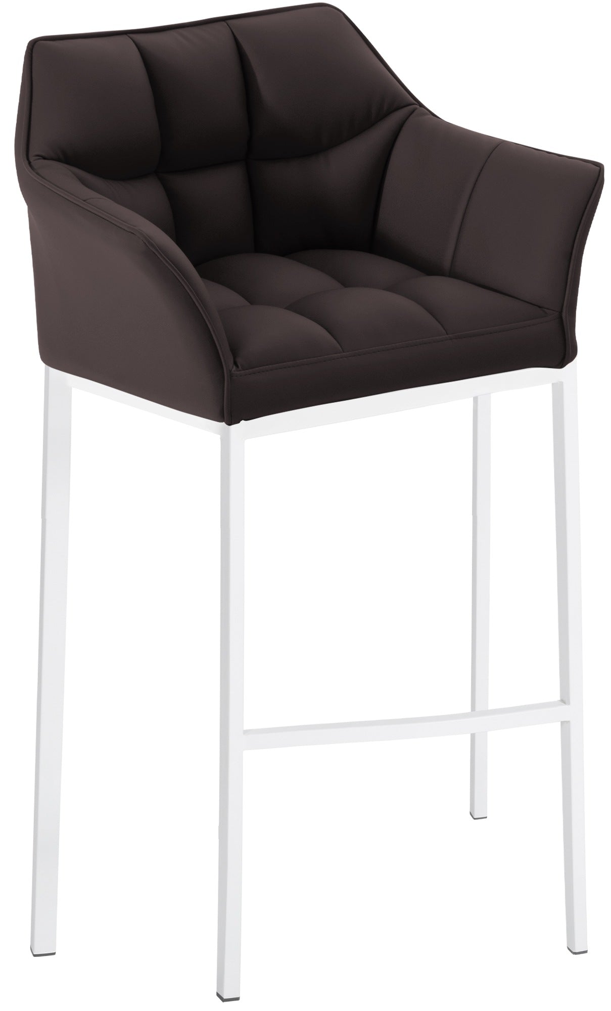 Tabouret de bar chaise haute de comptoir couture carrées assise en PVC marron 4 pieds stables en métal blanc 10_0004728