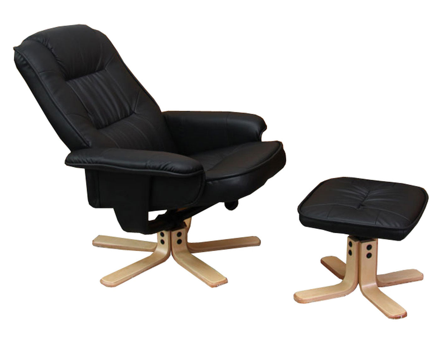 Fauteuil de relaxation TV avec repose-pieds tabouret pouf en PVC noir et bois d'eucalyptus 04_0006837
