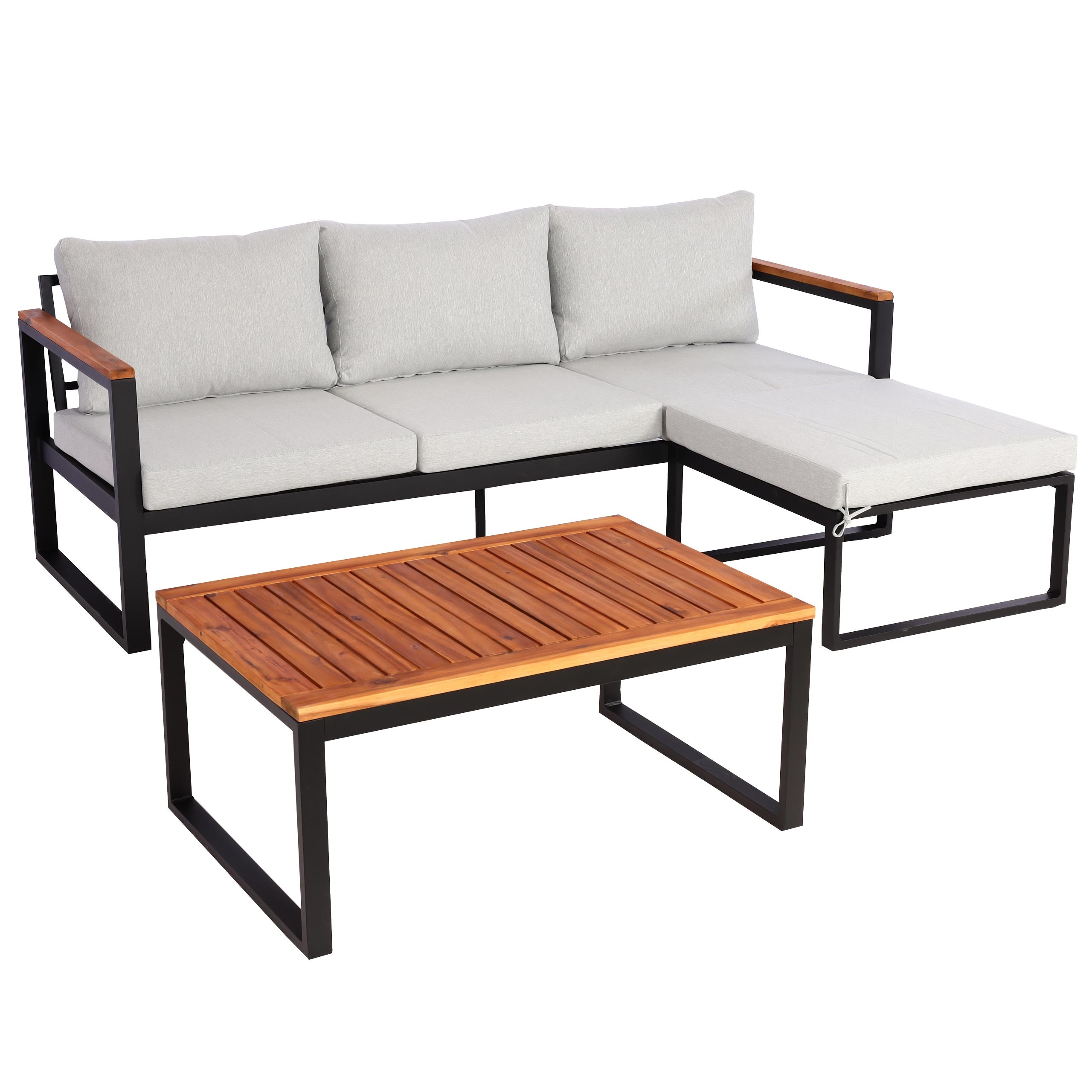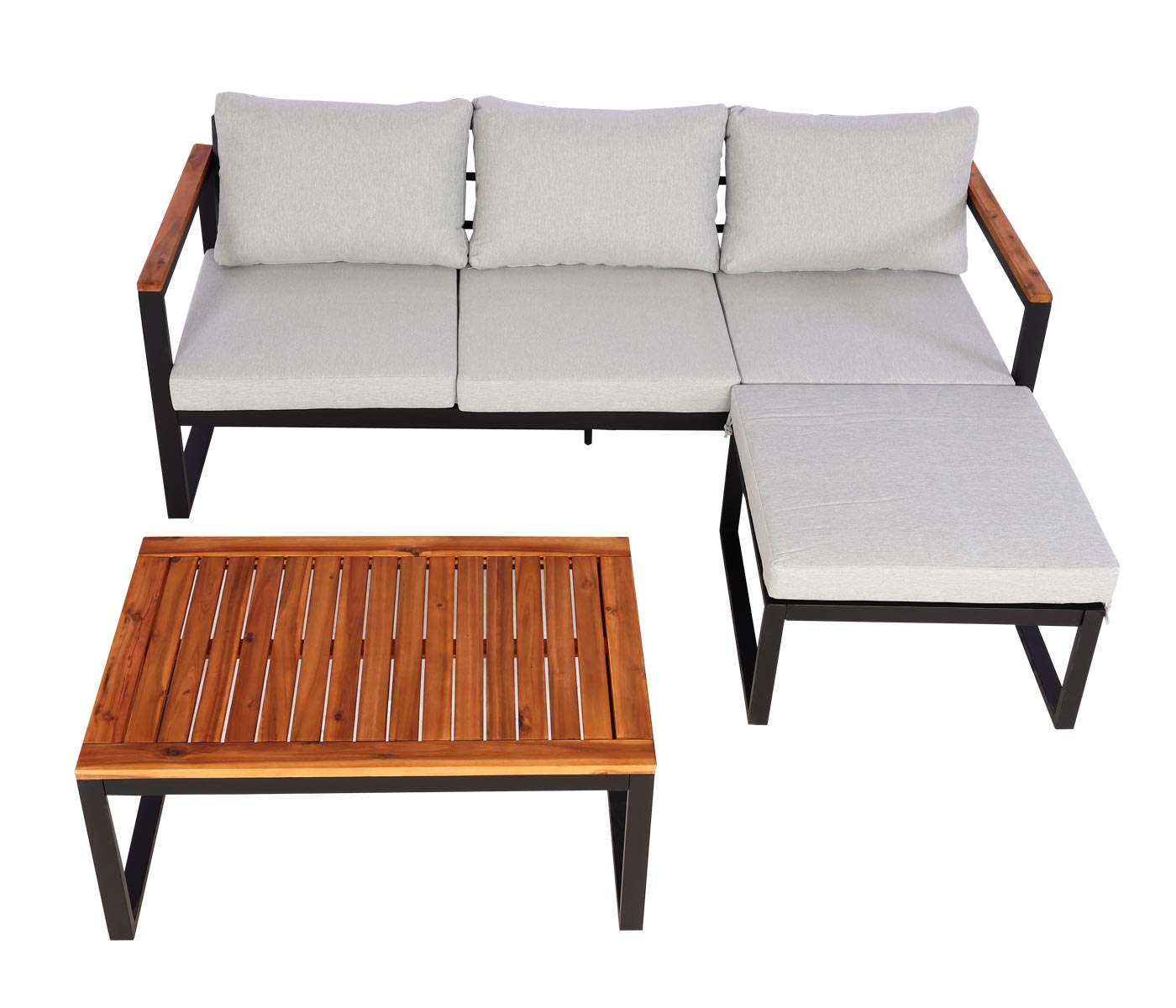 Salon de jardin canapé table aluminium et bois d'acacia avec coussins gris clair 04_0008312