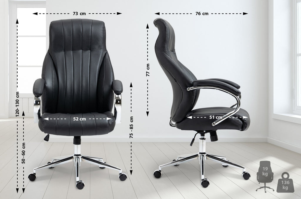 Notre fauteuil de bureau est particulièrement confortable, notamment grâce à son assise généreusement rembourrée et revêtue d'un véritable cuir de haute qualité