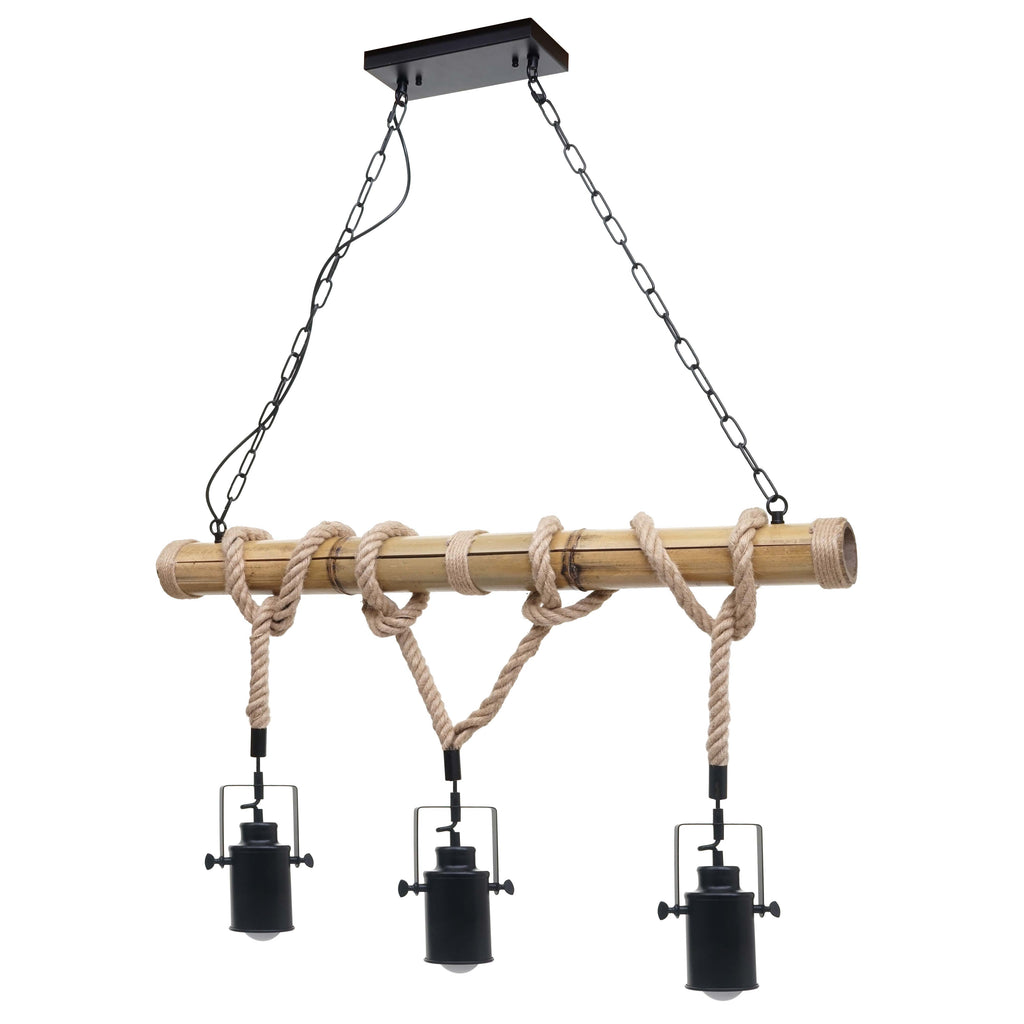 Lampe à suspension lustre corde de bambou vintage industrielle métal noir 3x abat-jour spot 04_0004047