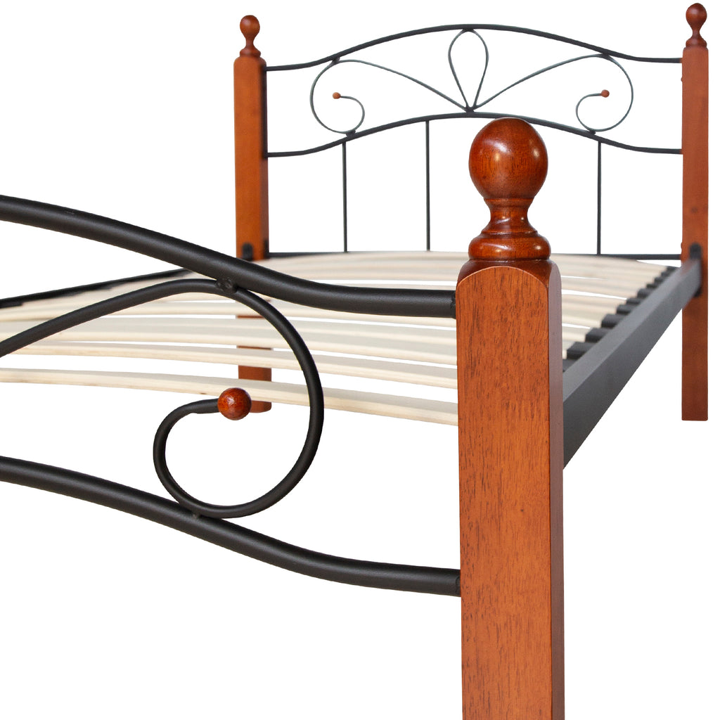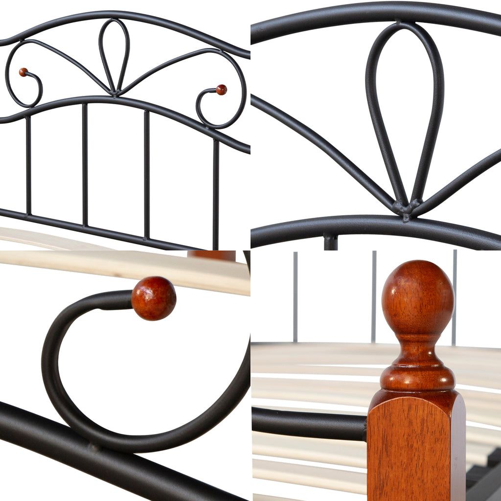 Cadre de lit en métal noir avec poteaux en bois marron foncé
