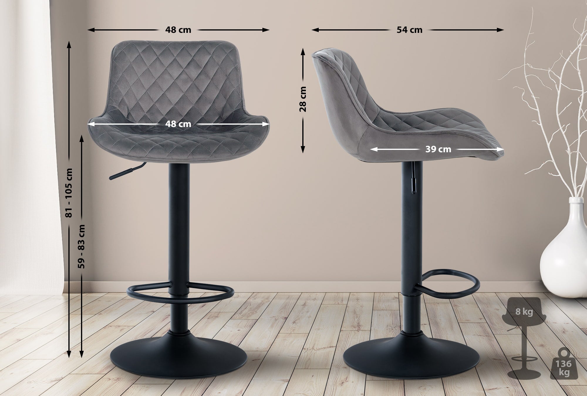 Grâce au vérin à gas prévu dans la colonne de la structure, ces tabourets de bar sont réglables en hauteur.