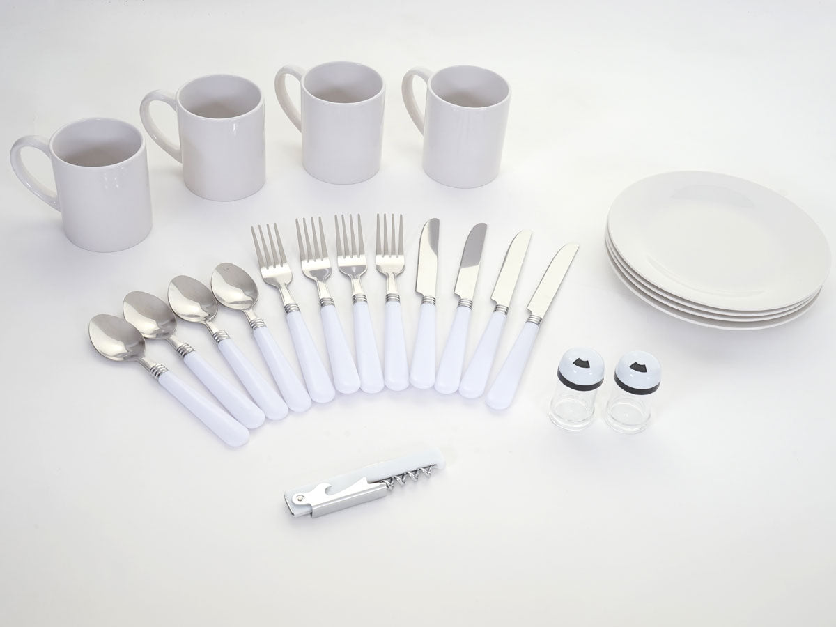 Une assiette, une tasse et des couverts sont inclus par personne. Comprenant une salière, une poivrière et un tire-bouchon, cet ensemble ne laisse rien à désirer.