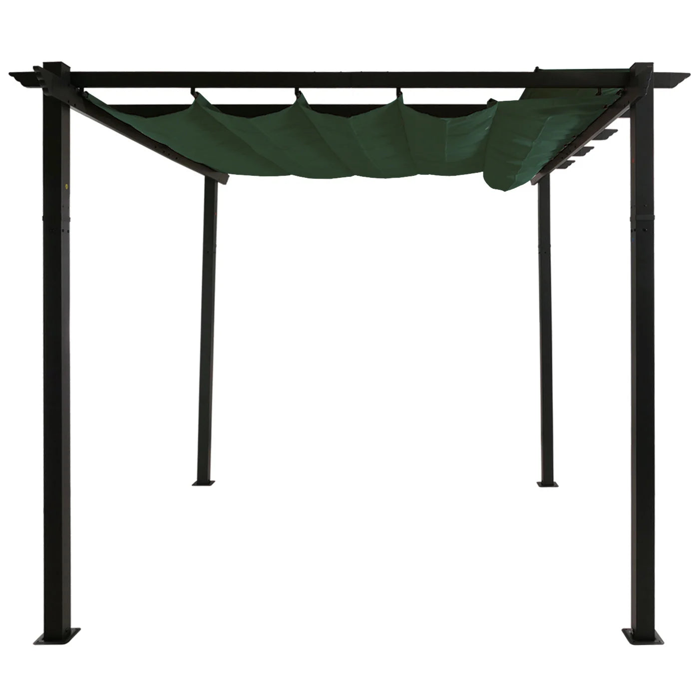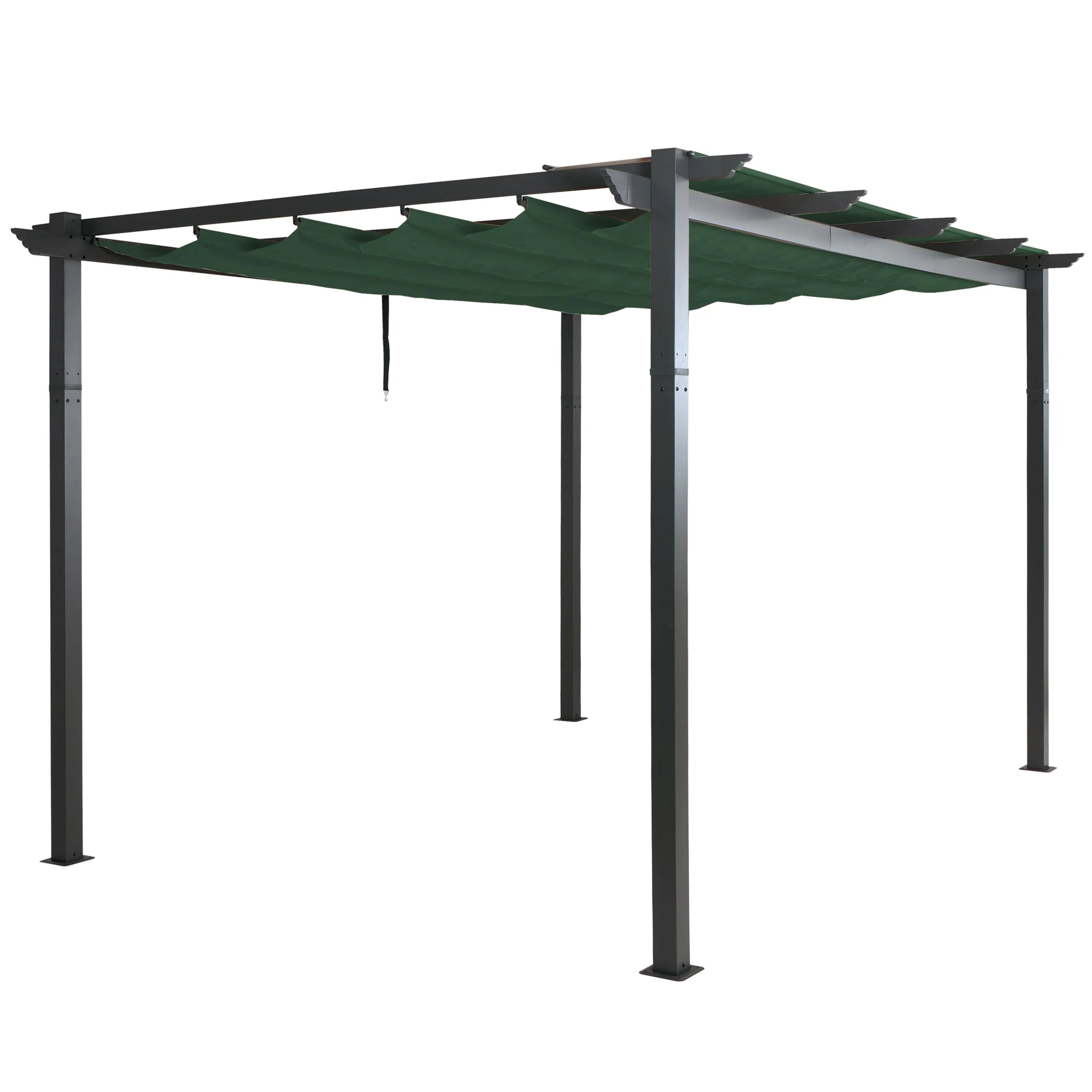 Un système de protection contre la pluie intégré protège le toit lorsqu’il est replié, tandis que la poignée textile permet à la fois de faire coulisser le toit et de le fixer en position. Le matériel de fixation inclus permet d’installer la pergola aussi bien sur des surfaces dures que sur des sols plus souples.