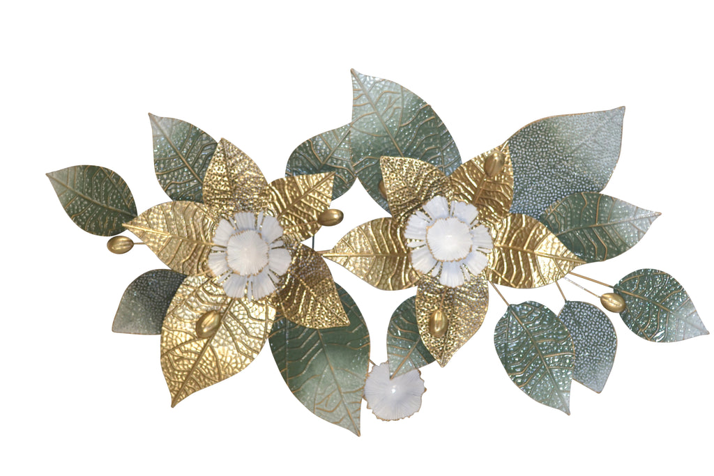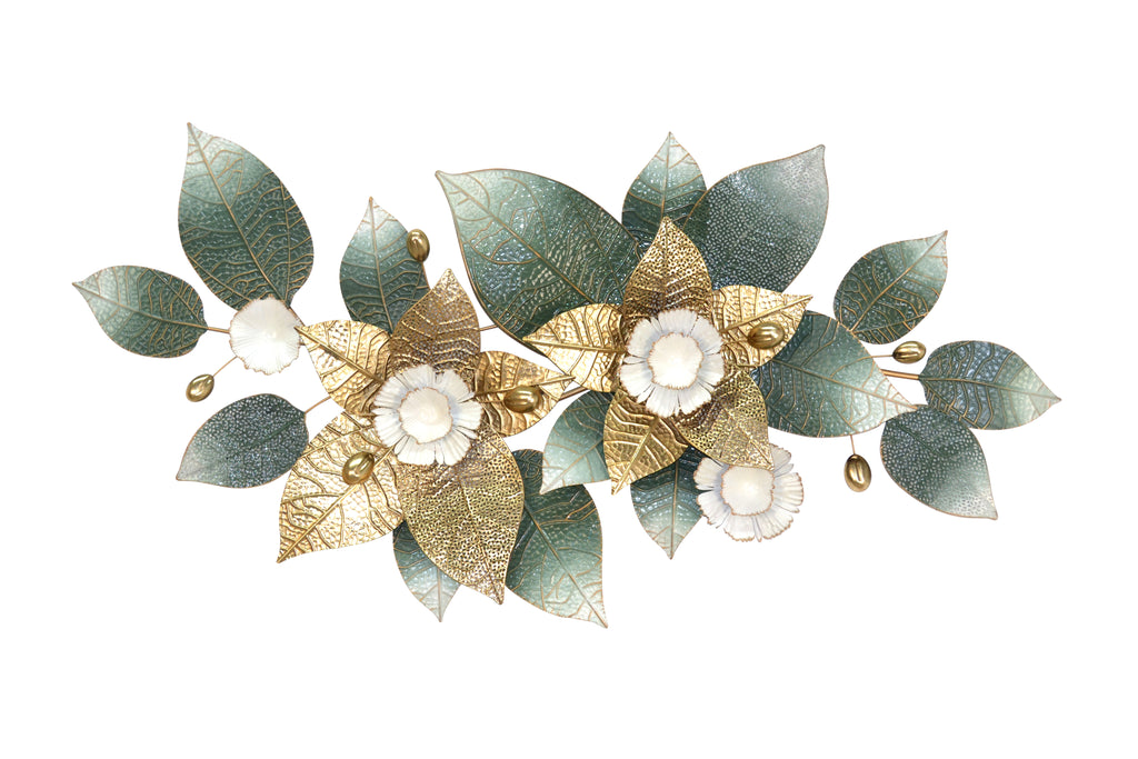 Décoration murale florale en métal – Feuilles et fleurs peintes en vert crème et or DEC050049