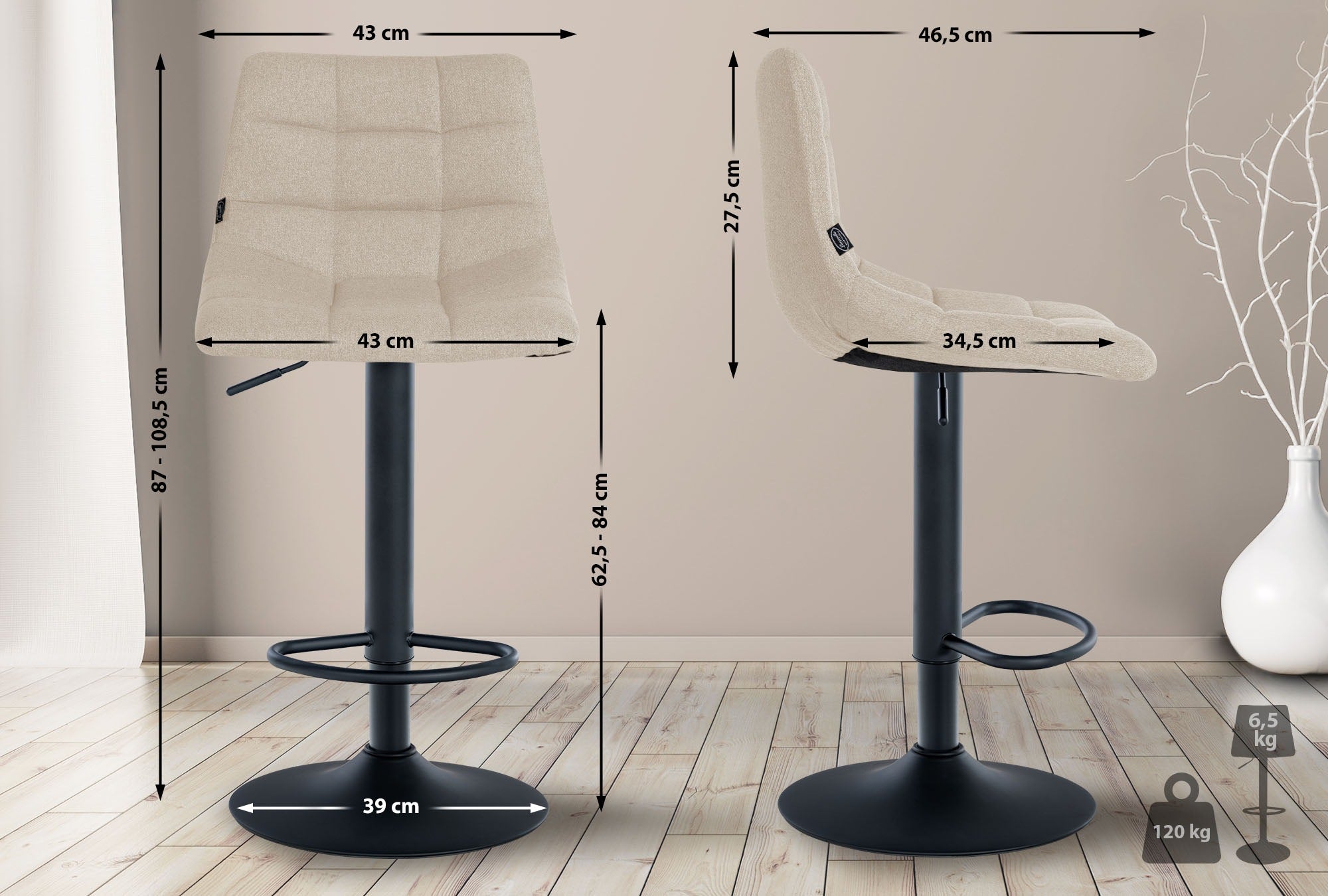 L'élégant tabouret de bar en tissu impressionne par son piètement en trompette réglable et son repose-pieds assorti, garantissant une assise confortable. La hauteur du tabouret s'ajuste facilement et rapidement à vos besoins, garantissant un ajustement parfait à votre table ou à votre comptoir. Le tabouret de bar pivote également à 360°, vous permettant de bouger librement.