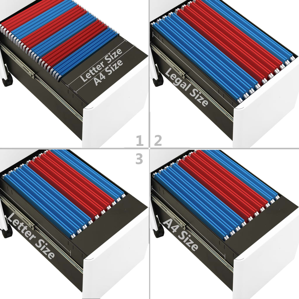 Chaque tiroir est équipé d’une barre de suspension amovible, qui peut être librement combinée pour stocker des dossiers suspendus de taille lettre, taille légale et A4.