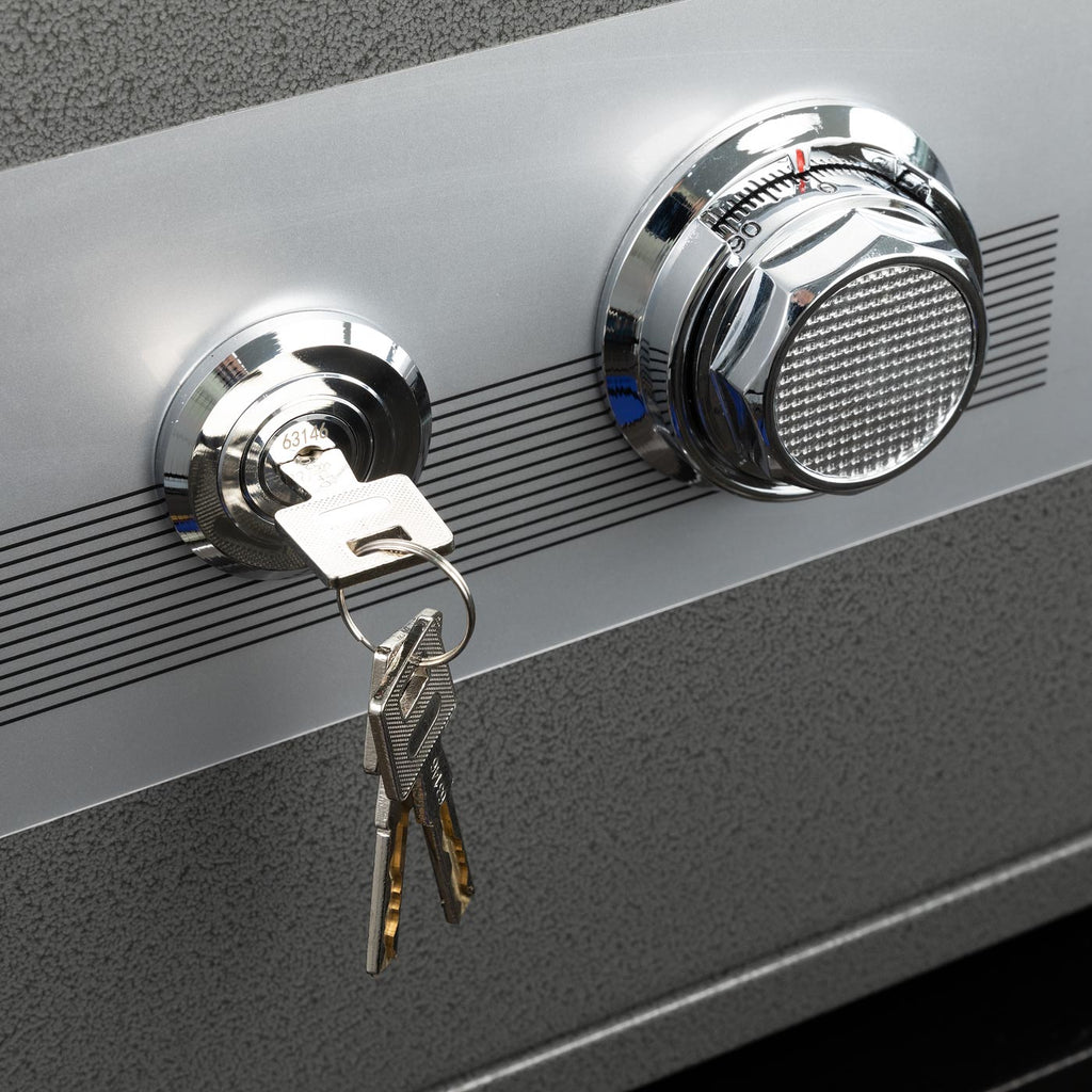 Pour plus de sécurité, le coffre-fort dispose d'un double système de sécurité composé d'une serrure et d'une serrure 4- code numérique à chiffres. Pour ouvrir le coffre-fort, vous avez besoin de la clé et du code. Si vous disposez uniquement du code ou simplement de la clé, le coffre-fort ne peut pas être ouvert.