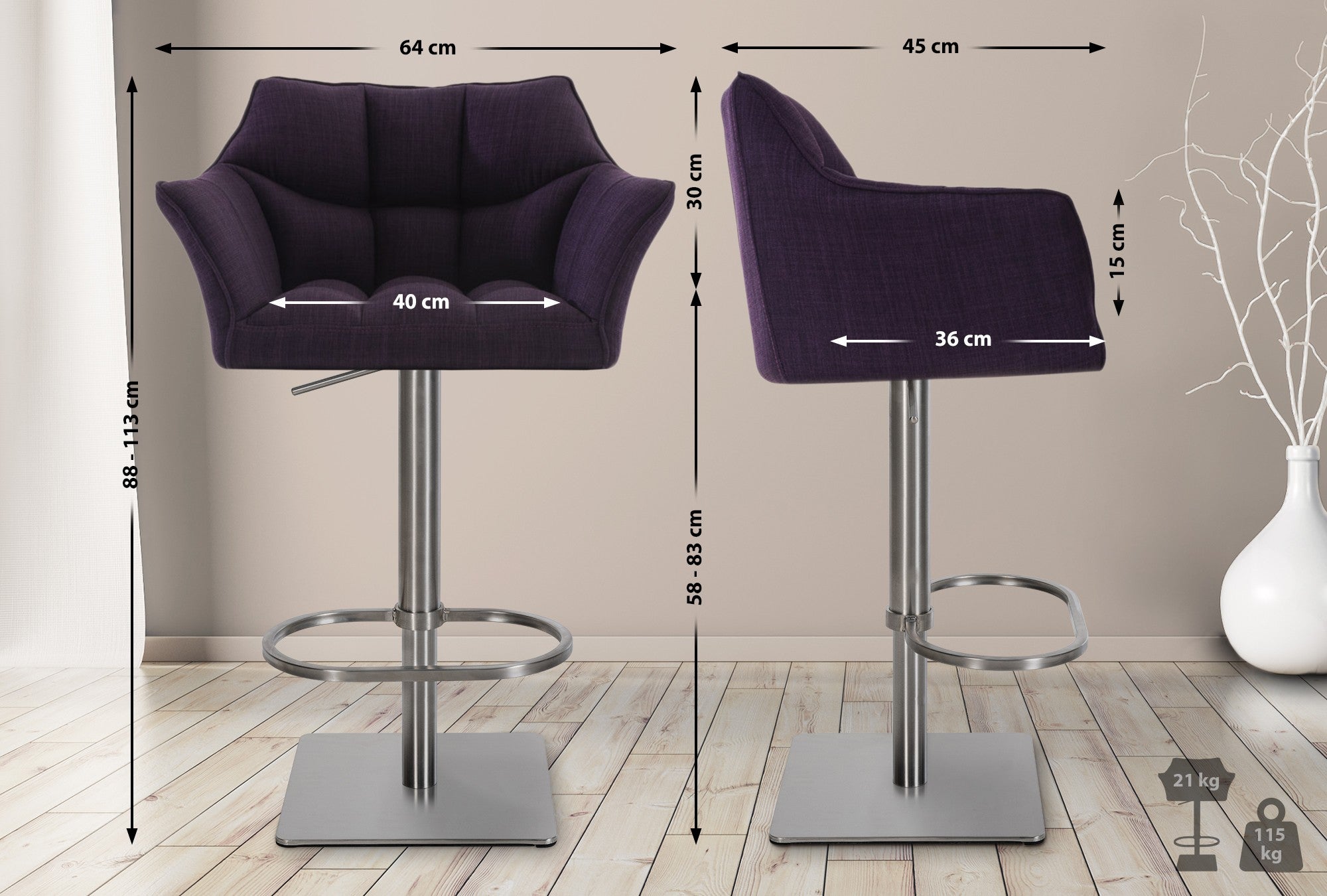 Lot de 2 tabourets de bar réglable en tissu violet assise enveloppante capitonnée avec base carrée en acier inoxydable 10_0006571