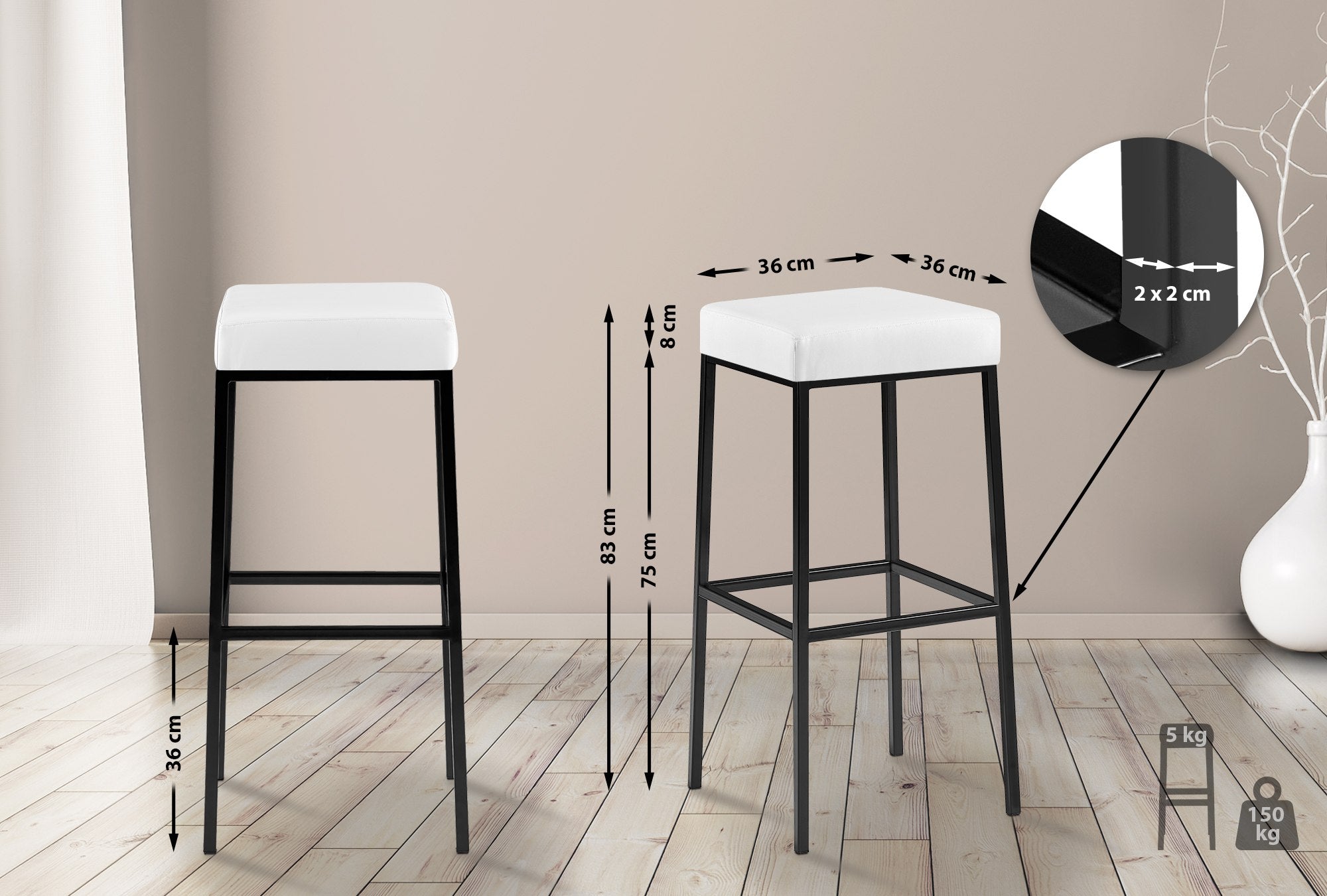 L'assise carrée du tabouret de bar est confortable, même sans accoudoirs ni dossier. Le revêtement en similicuir résistant et facile d'entretien garantit ce confort.