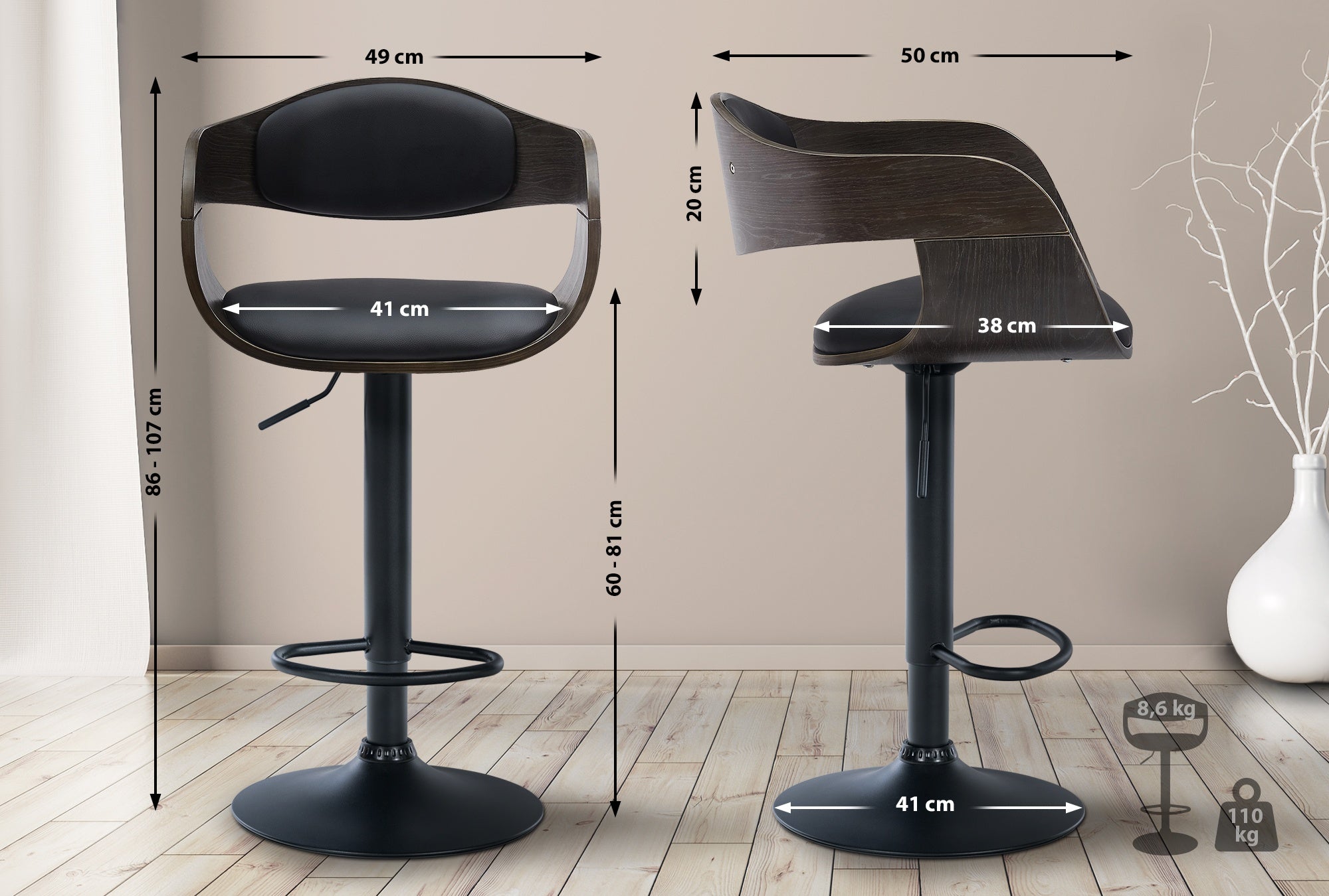 L'originalité du tabouret de bar réside dans le mélange harmonieux et élégant du bois, pour la coque du siège en similicuir et du métal pour le Piètement. Le siège de ce modèle est, en effet, constitué d'une coque en bois et du revêtement de haute qualité et facile à entretenir. L'assise et le dossier ajouré sont confortablement rembourrés pour assurer le confort à l'assise. Le siège repose sur un support en métal noir avec un repose-pieds circulaire intégré. La colonne du piètement est supportée par une base ronde pour assurer la stabilité. Cette dernière est munie d'un protecteur de sol pour éviter les rayures et d'éventuels dérapages.