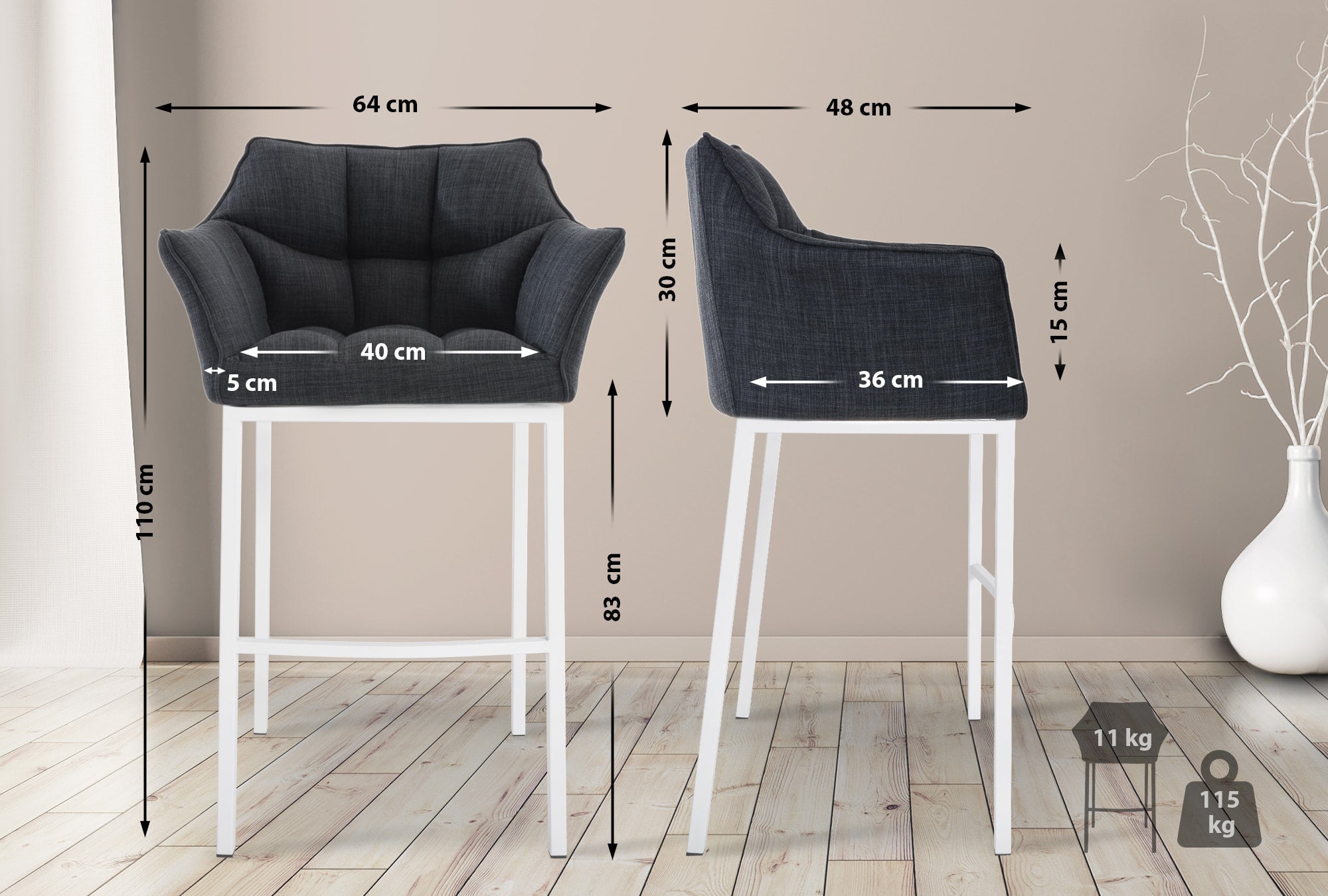 Tabouret de bar x1 assise enveloppante capitonnée en tissu gris foncé avec structure à 4 pieds en métal blanc 10_0006167