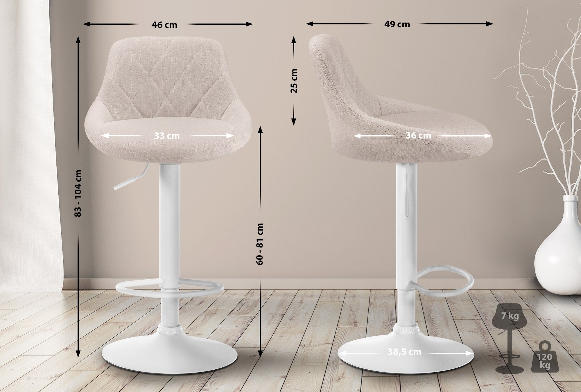 Tabouret de bar chaise haute x 1 avec coutures décoratives assise en tissu crème pieds métal blanc 10_0005091