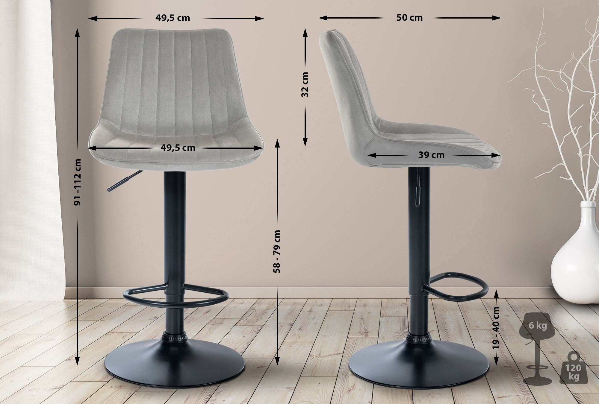 Tabouret de bar x1 réglable en hauteur pivotant à 360° assise en velours gris couture verticale pied métal noir 10_0005429