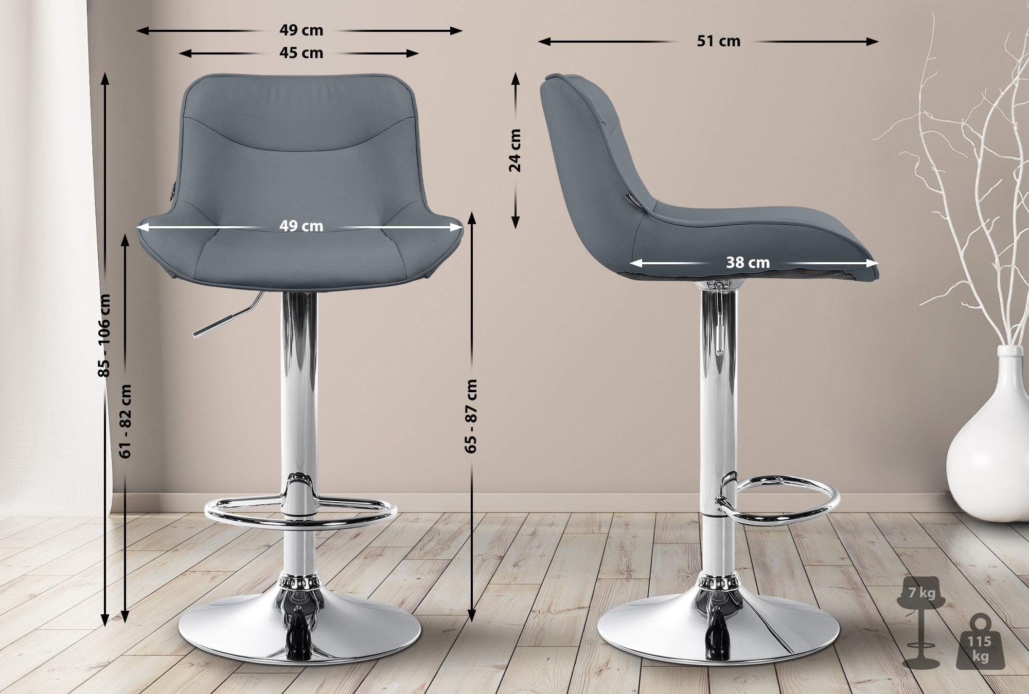Hauteur d'assise : 61 - 82 cm