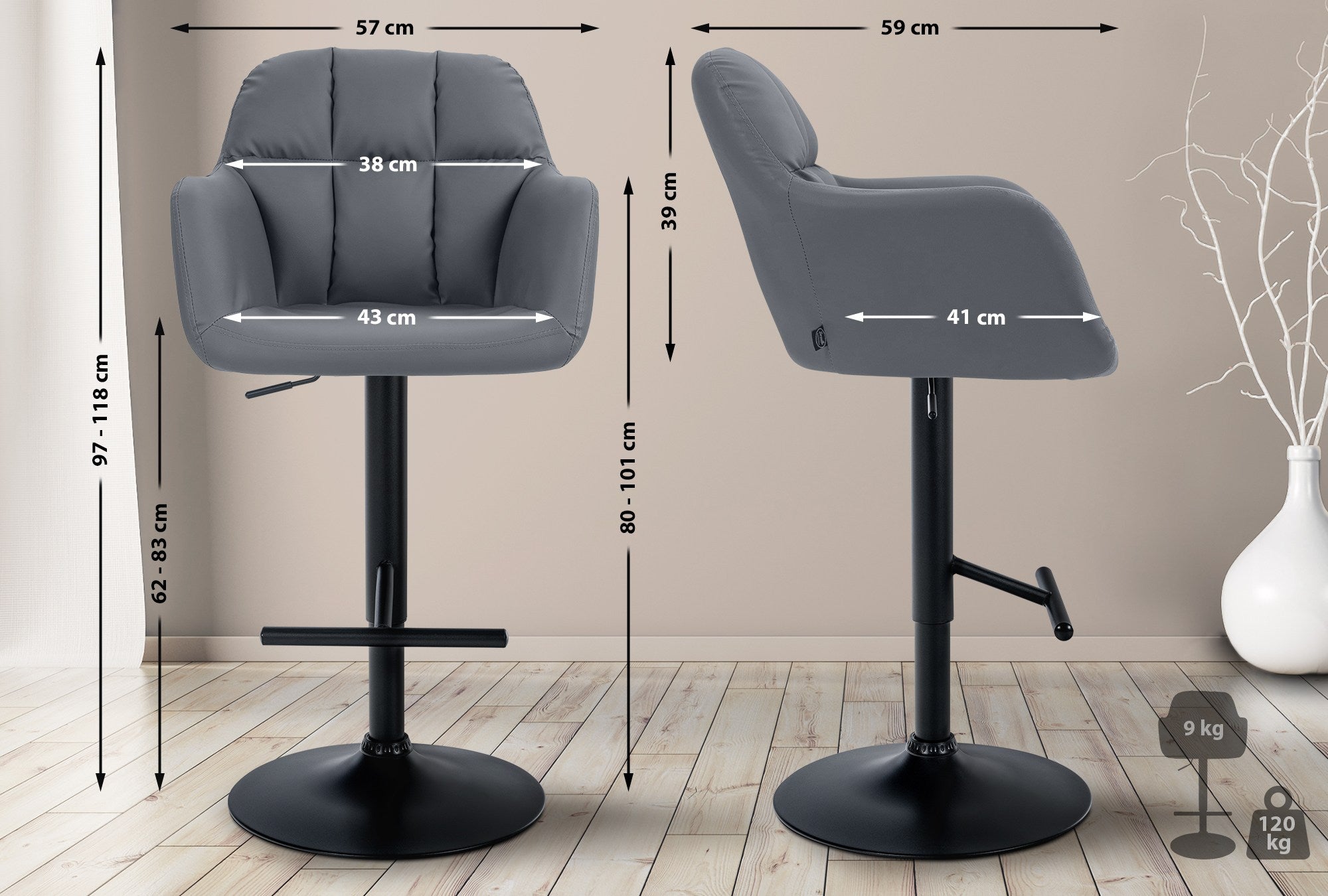 Le tabouret de bar se distingue par son design fonctionnel et son confort d'assise. Sa hauteur réglable de 97 à 118 cm ainsi que sa largeur de 57 cm et sa profondeur de 59 cm permettent de l'adapter aux hauteurs de comptoir les plus diverses. L'assise de 43 x 41 cm et le dossier sont conçus pour offrir soutien et confort. Des accoudoirs et un repose-pieds sur le pied en trompette complètent la fonctionnalité, tandis que la protection du sol évite d'endommager le support. Avec un poids de 9 kg et une capacité de charge allant jusqu'à 120 kg, le tabouret de bar est un siège robuste. La fonction de rotation à 360° favorise en outre la mobilité et la flexibilité.