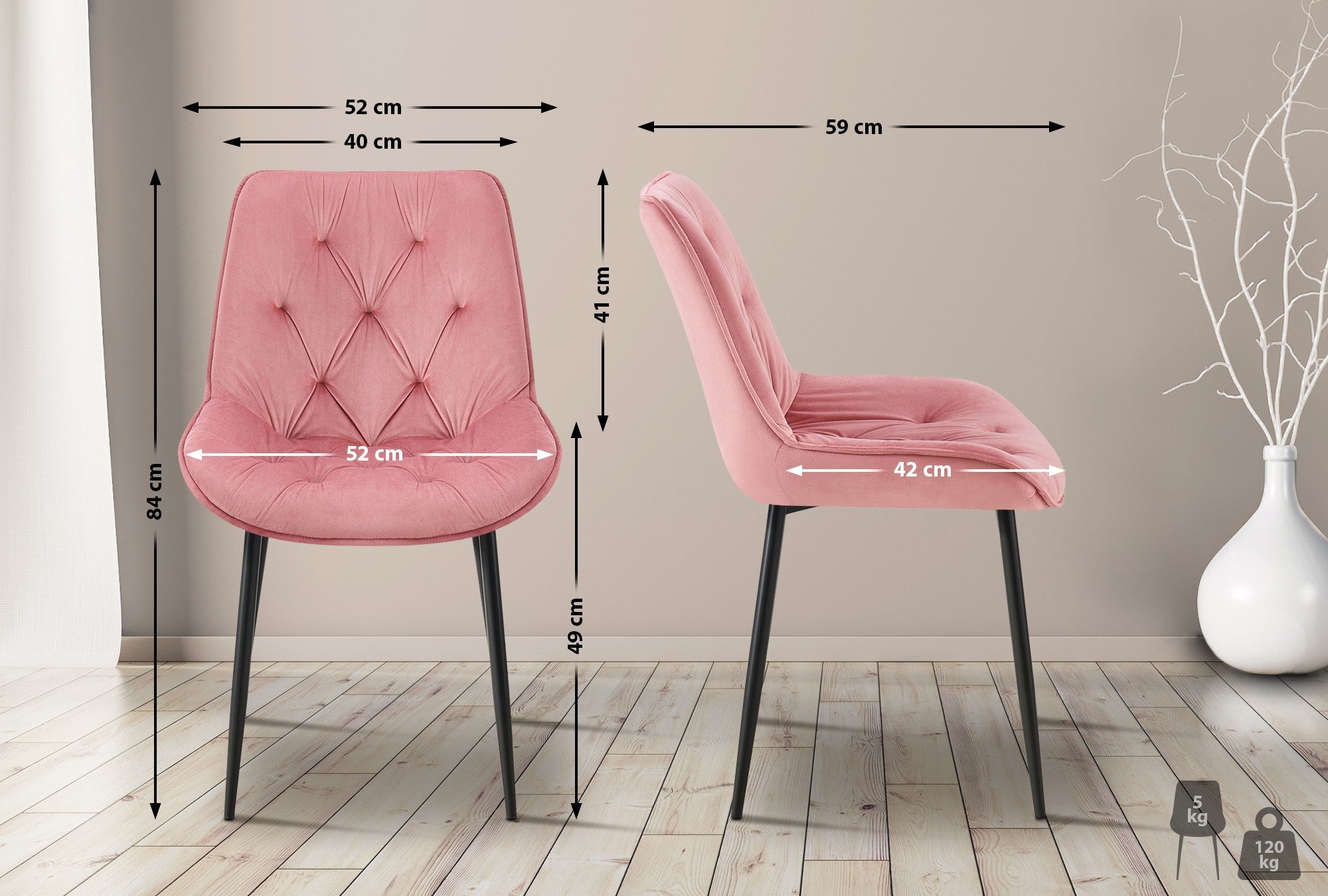 La chaise de salle à manger allie confort d'assise et style moderne. Cette chaise rembourrée est idéale pour votre table de salle à manger, votre cuisine, votre salon et bien plus encore. Le rembourrage agréable de l'assise et du dossier est essentiel pour un confort optimal. L'assise est recouverte de velours facile d'entretien avec un motif matelassé tendance. La base de cette chaise de salle à manger est un cadre stable à quatre pieds noir en métal robuste. Ainsi, la chaise de cuisine peut supporter en toute sécurité une charge allant jusqu'à 120 kg. Les patins de protection protègent les sols fragiles.