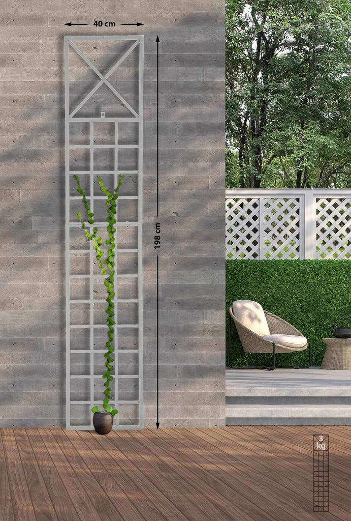 Le treillis est un excellent moyen de mettre en valeur de manière créative et habile vos surfaces murales avec des roses et autres plantes grimpantes. Le mur peut être facilement embelli avec une plante grimpante sans que la plante elle-même ne soit envahie par la végétation. Le treillis est vissé directement au mur avec 2 vis et peut donc supporter n'importe quel poids des plantes, même lorsqu'elles sont en pleine floraison. La clôture en treillis a été fabriquée à la main en fer et est donc extrêmement stable. La surface est finie avec une patine antique fabriquée à la main.