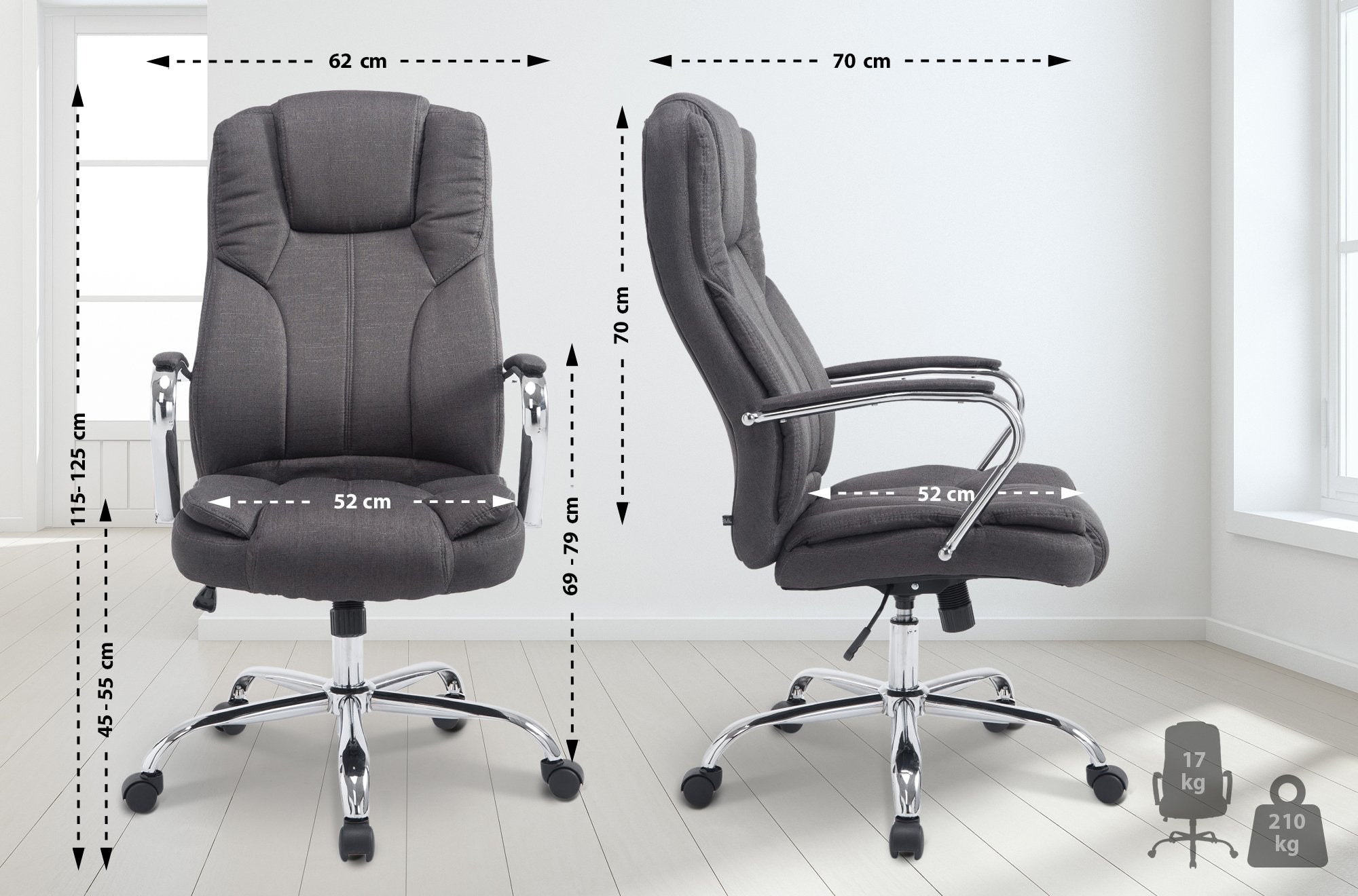 Fauteuil de bureau sur roulettes largeur d'assise XXL en tissu gris foncé et métal chromé 10_0006960