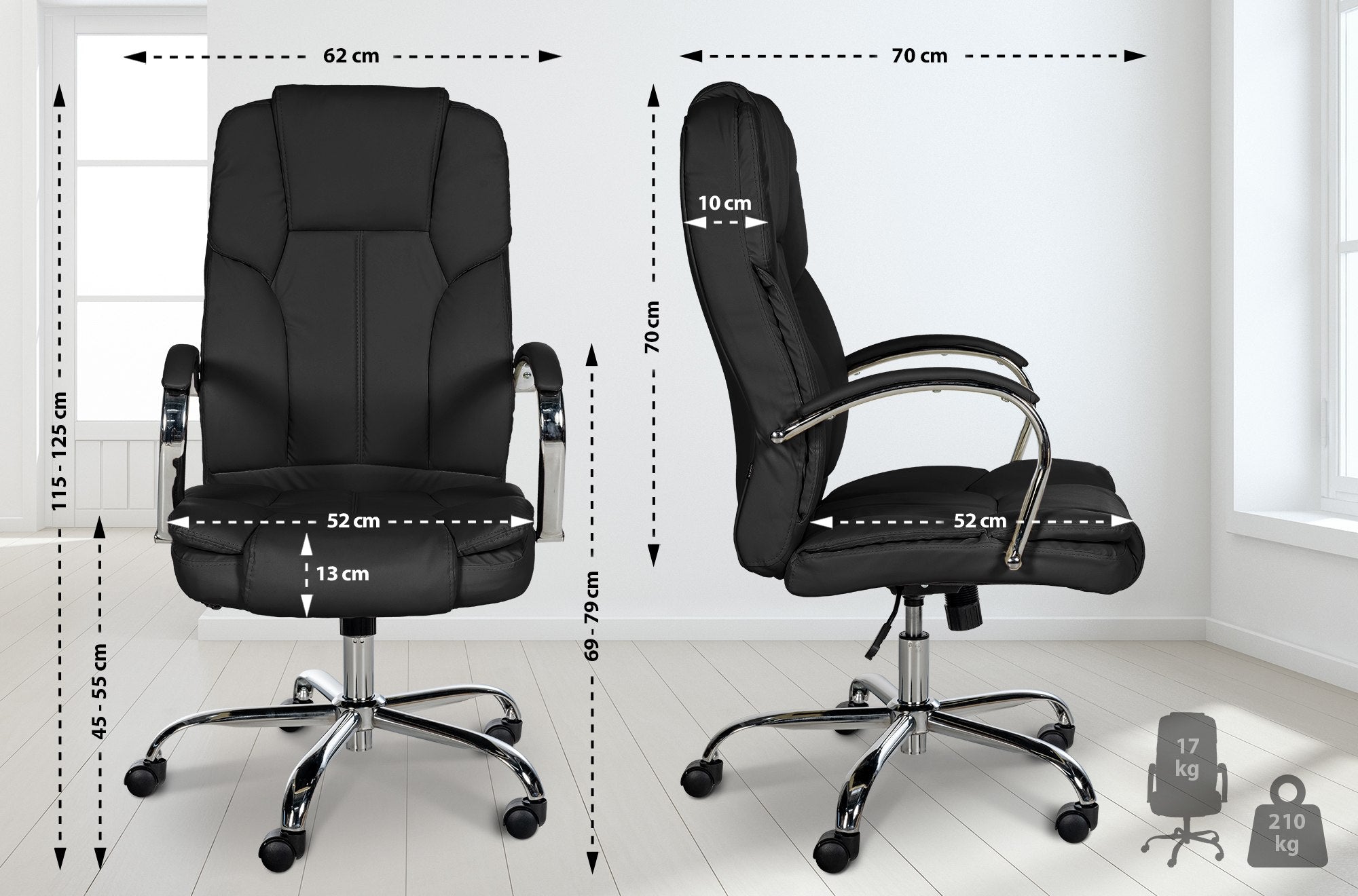 Chaise de bureau sur roulettes assise XXL réglage en hauteur accoudoirs en similicuir noir cadre métal 10_0006910