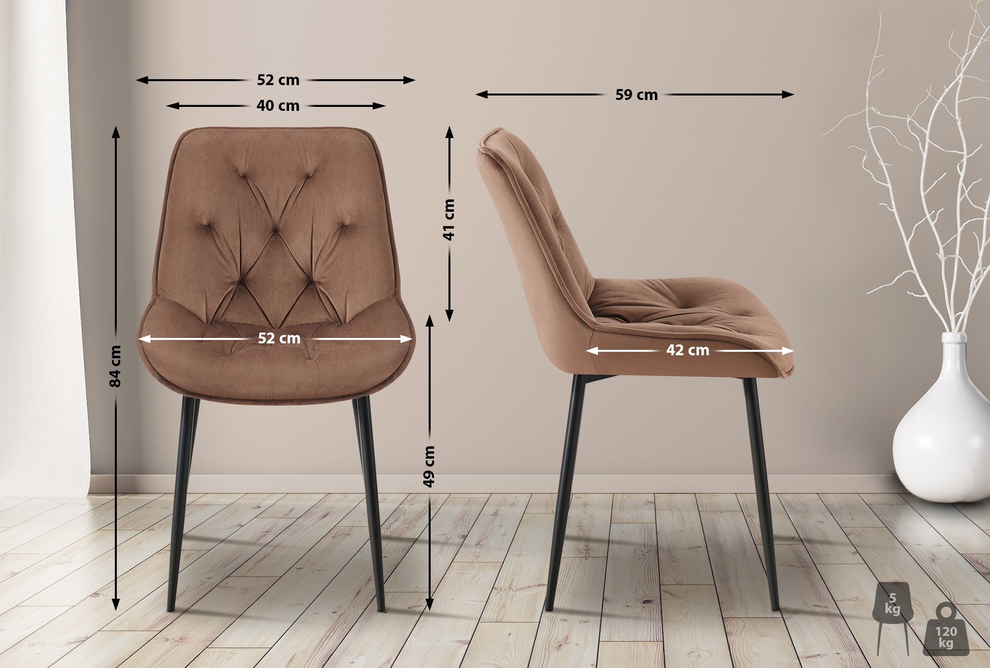 La chaise de salle à manger allie confort d'assise et style moderne. Cette chaise rembourrée est idéale pour votre table de salle à manger, votre cuisine, votre salon et bien plus encore. Le rembourrage agréable de l'assise et du dossier est essentiel pour un confort optimal. L'assise est recouverte de velours facile d'entretien avec un motif matelassé tendance. La base de cette chaise de salle à manger est un cadre stable à quatre pieds noir en métal robuste. Ainsi, la chaise de cuisine peut supporter en toute sécurité une charge allant jusqu'à 120 kg. Les patins de protection protègent les sols fragiles.