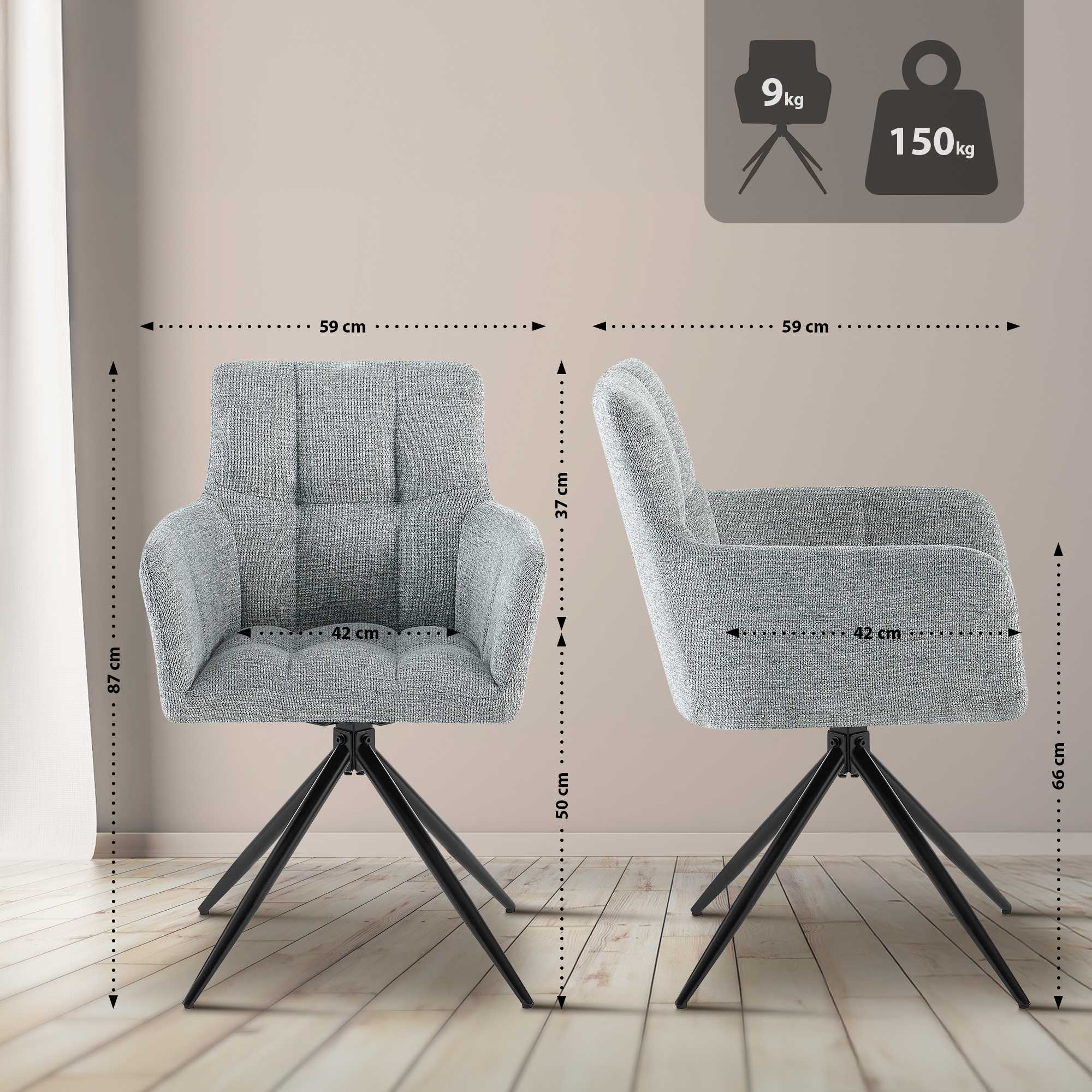 Lot de 2 chaises de salle à manger moderne et confort mécanisme de rotation à 180° en tissu gris clair et métal 10_0007536