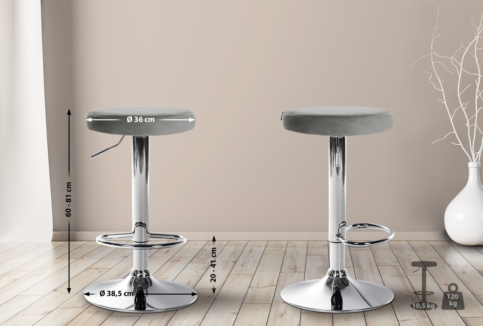 Lot de 2 tabourets de bar avec assise en tissu velours gris et cadre métal chromé