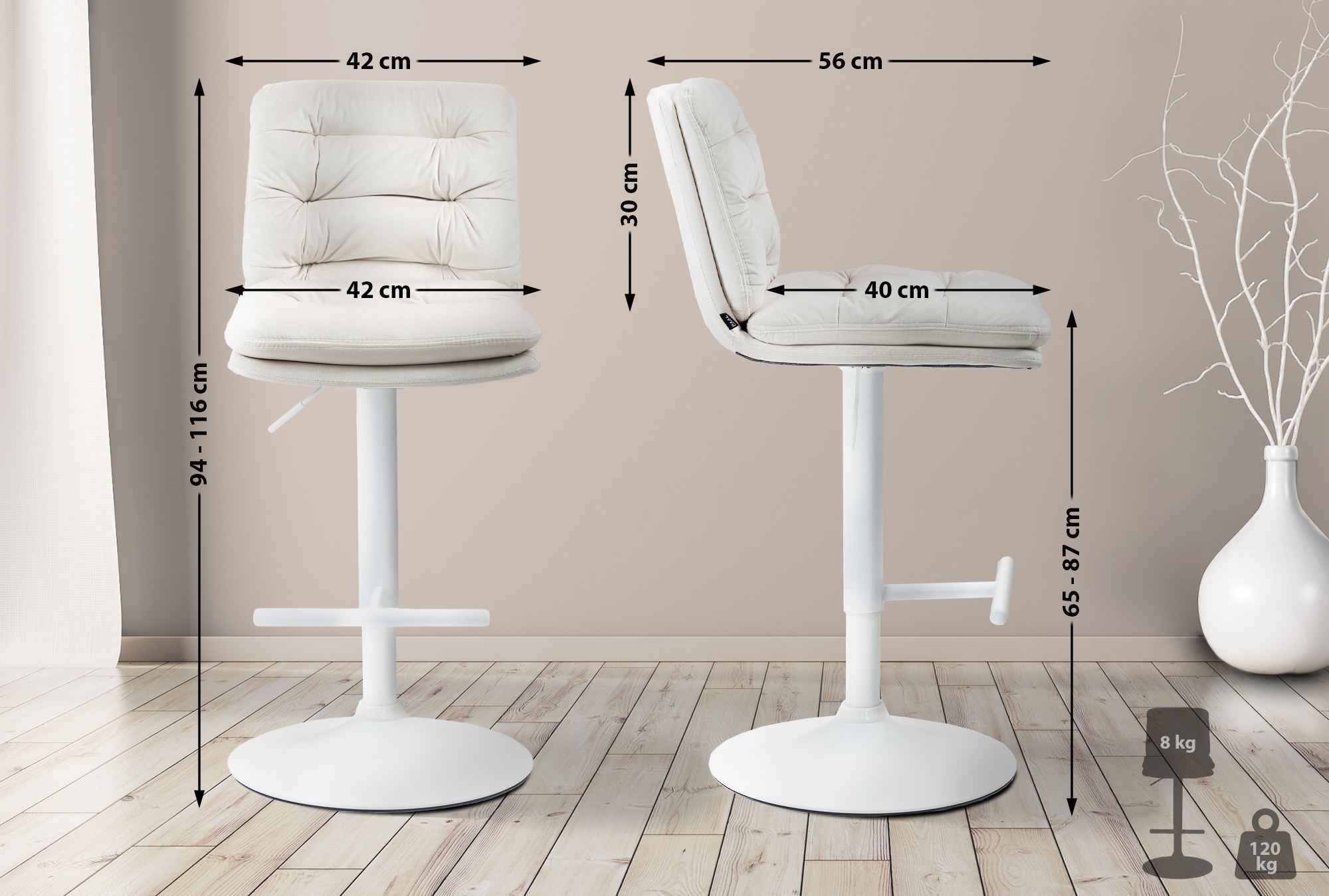 La structure et le revêtement tendance lui confèrent une allure élégante. L'assise est recouverte d'un velours élégant. La structure métallique est réglable en hauteur et la fonction pivotante à 360 degrés assure une grande liberté de mouvement.